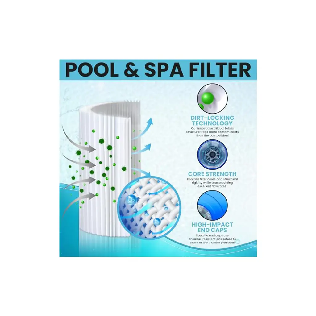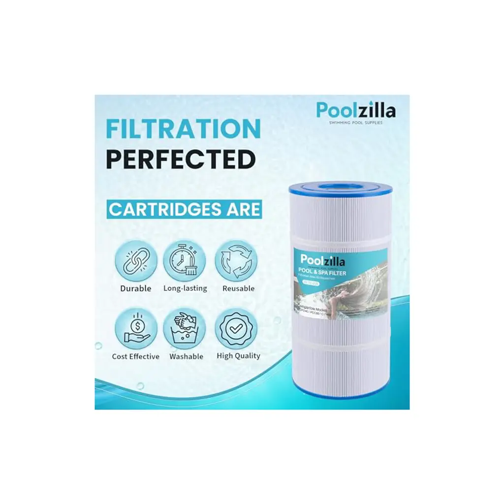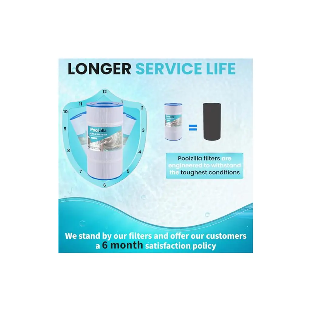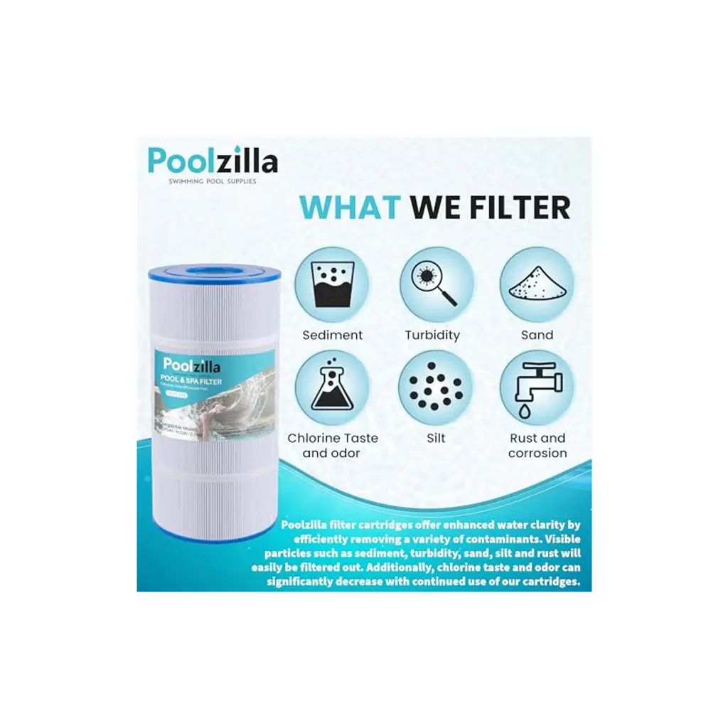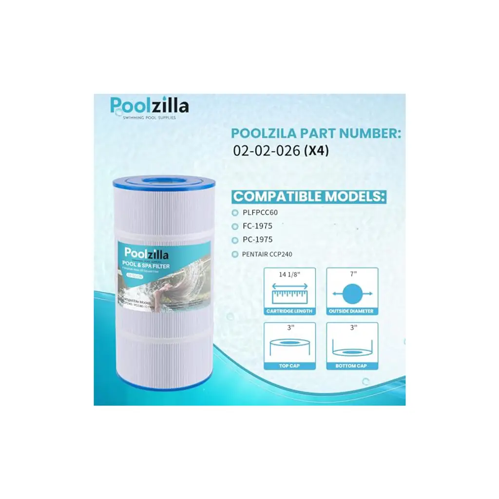 💧【Compatible Models】Length: 14 1/8"; Outside Diameter: 7”; Top Opening: 3"; Bottom Opening: 3". Replacement PLFPCC60 Filter Cartridge for Pleatco PCC60, Pentair CCP240, R173572, 178569, Unicel C-7469, Filbur FC-1975, Pure N Clean PC-1975, PC-6460. NOTE: This is a compatible spare part and the manufacturers' names and part numbers have been used for reference purposes only. Poolzilla is an independent brand.💧【Premier Performance】Our filters are engineered with “Dirt-Trap” technology that enables the filter to trap more contaminants than traditional round fabric. This results in a cleaner filtration system and a healthier swimming environment. Our filters effectively trap leaves, bugs, sediment, hair, and more.💧【Long Lifespan】Premium pleated fabric is durable in the harshest conditions. Even with significant contaminant buildup, our filters are designed to maintain maximum flow rates throughout the season. Cleaning the filter is easily done by removing and washing with water. Filter service life is around 1-2 years with proper maintenance.💧【Purified】Poolzilla filter cartridges offer enhanced water clarity by efficiently removing a variety of contaminants. Visible particles such as sediment, turbidity, sand, silt, and rust will easily be filtered out. Additionally, chlorine taste and odor can significantly decrease with continued use of our cartridges.💧【Quality Customer Service】Poolzilla cares deeply about the integrity of our products. We promise a risk-free shopping experience fully backed by our Quality Control, Customer Service and Technical Support Teams, located in New Jersey.