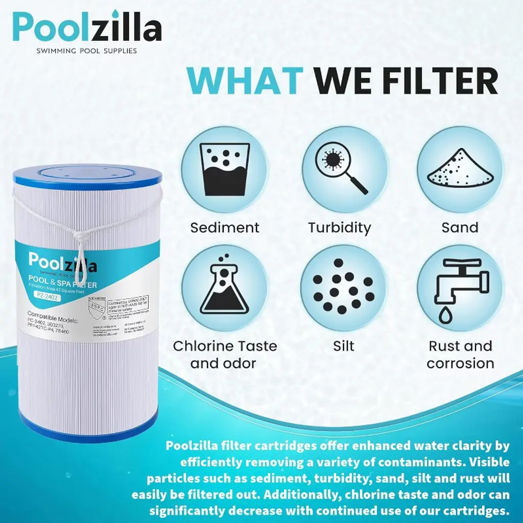 💧【Compatible Models】 Length: 9 3/8"; Outside Diameter: 5 1/4"; Top: Closed with String Handle; Bottom: 1 1/2" MPT Threaded. PLFFC-2402 Spa Filter compatible Watkins 303279, 78460, PFF42TC-P4, Filbur FC-2402, ACT-50SQFLTR, LSX1057.NOTE: This is a compatible spare part and the manufacturers' names and part numbers have been used for reference purposes only. Poolzilla is an independent brand.💧【Premier Performance】Our filters are engineered with “Dirt-Trap” technology that enables the filter to trap more contaminants than traditional round fabric. This results in a cleaner filtration system and a healthier swimming environment. Our filters effectively trap leaves, bugs, sediment, hair, and more.💧【Long Lifespan】Premium pleated fabric is durable in the harshest conditions. Even with significant contaminant buildup, our filters are designed to maintain maximum flow rates throughout the season. Cleaning the filter is easily done by removing and washing with water. Filter service life is around 1-2 years with proper maintenance.💧【Purified】Poolzilla filter cartridges offer enhanced water clarity by efficiently removing a variety of contaminants. Visible particles such as sediment, turbidity, sand, silt, and rust will easily be filtered out. Additionally, chlorine taste and odor can significantly decrease with continued use of our cartridges.💧【Quality Customer Service】Poolzilla cares deeply about the integrity of our products. We promise a risk-free shopping experience fully backed by our Quality Control, Customer Service and Technical Support Teams, located in New Jersey.