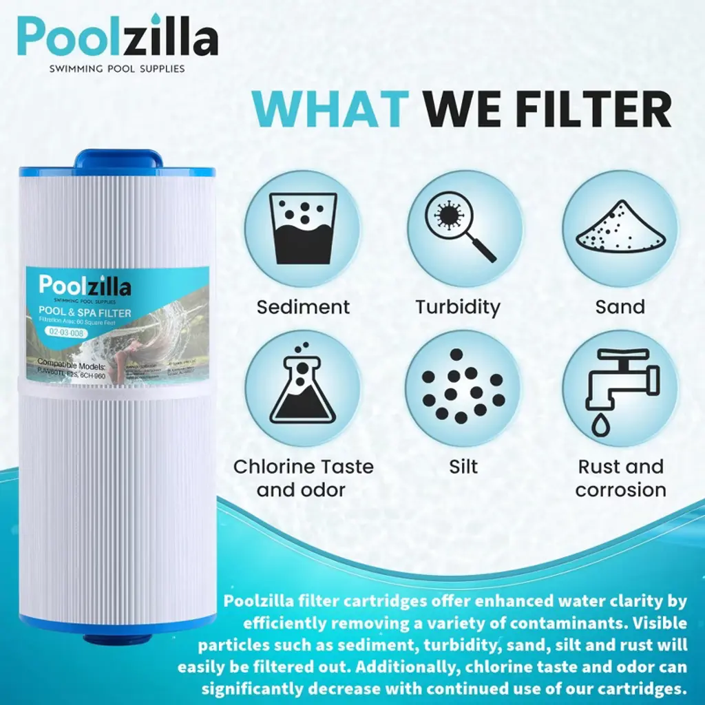 💧【Compatible Models】Length: 14 7/8"; Outside Diameter: 6 5/8”; Top Opening: Handle; Bottom Opening: 2". Replacement PLF6CH-960 Filter Cartridge for Unicel 6CH-960, Pleatco PJW60TL-F2S, Filbur FC-2800, Jacuzzi Premium J-300 and J400, 6541-383. NOTE: This is a compatible spare part and the manufacturers' names and part numbers have been used for reference purposes only. Poolzilla is an independent brand.💧【Peak Performance】Innovative "Dirt-Trap" technology enables the fabric to trap more contaminants than traditional round fabric. This filter efficiently removes hair, leaves, dust, sediment, sand, etc. Enjoy clean leisure time in your spa and hot tub.💧【Long Lifespan】Premium pleated fabric is durable in the harshest conditions. Even with significant debris buildup, our filters are designed to maintain maximum flow rates throughout the season. Cleaning the filter is easily done by removing and washing with water. Filter service life is around 1-2 years with proper maintenance.💧【Purified】Poolzilla filter cartridges offer enhanced water clarity by efficiently removing a variety of contaminants. Visible particles such as sediment, turbidity, sand, silt, and rust will easily be filtered out. Additionally, chlorine taste and odor can significantly decrease with continued use of our cartridges.💧【Quality Customer Service】Poolzilla cares deeply about the integrity of our products. We promise a risk-free shopping experience fully backed by our Quality Control, Customer Service and Technical Support Teams, located in New Jersey.