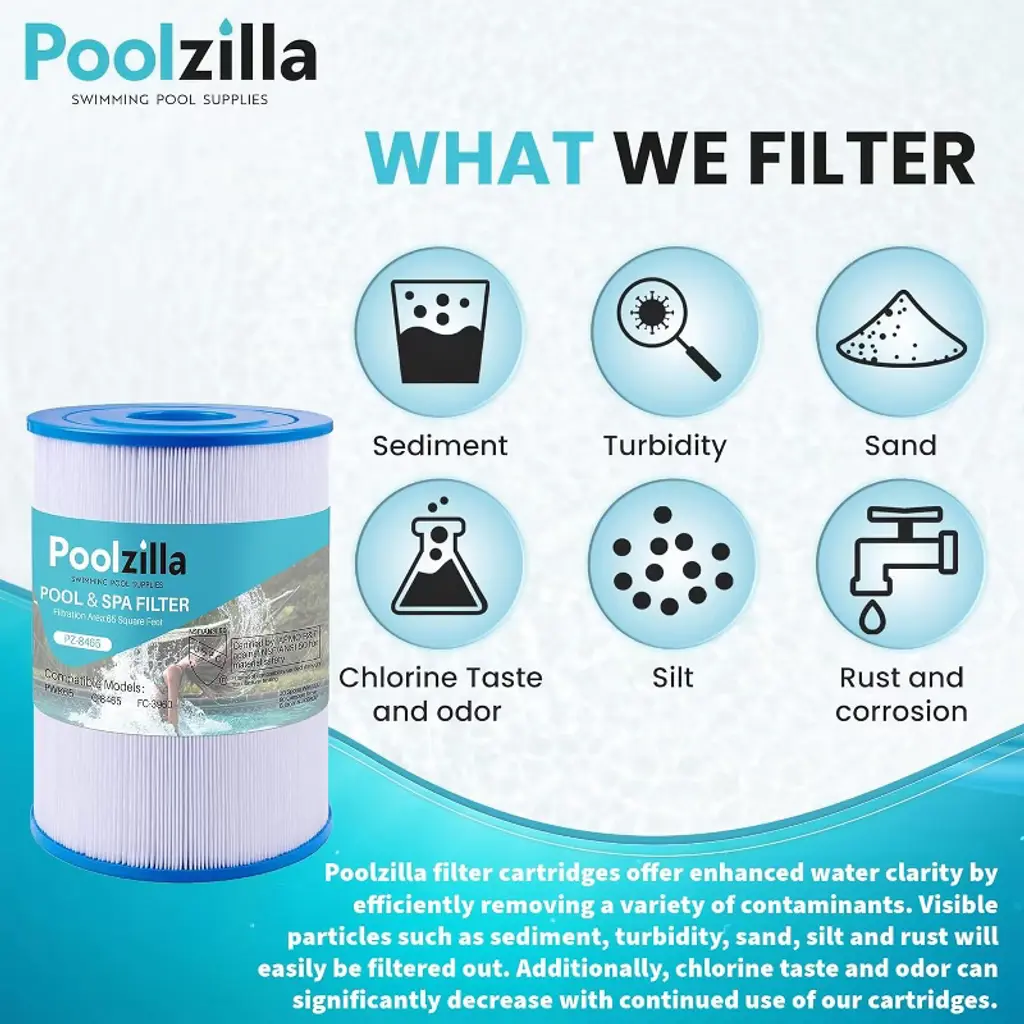 💧【Compatible Models】 This Spa Filter Cartridge Replacement is compatible with Watkins 31114, PWK65, Unicel C-8465, Filbur FC-3960, 71827, Tiger River Caspian, Bengal, Sumatran, Caldera 76136. NOTE: This is a compatible spare part and the manufacturers' names and part numbers have been used for reference purposes only. Poolzilla is an independent brand.💧【Premier Performance】Our filters are engineered with “Dirt-Trap” technology that enables the filter to trap more contaminants than traditional round fabric. This results in a cleaner filtration system and a healthier swimming environment. Our filters effectively trap leaves, bugs, sediment, hair, and more.💧【Long Lifespan】Premium pleated fabric is durable in the harshest conditions. Even with significant contaminant buildup, our filters are designed to maintain maximum flow rates throughout the season. Cleaning the filter is easily done by removing and washing with water. Filter service life is around 1-2 years with proper maintenance.💧【Purified】Poolzilla filter cartridges offer enhanced water clarity by efficiently removing a variety of contaminants. Visible particles such as sediment, turbidity, sand, silt, and rust will easily be filtered out. Additionally, chlorine taste and odor can significantly decrease with continued use of our cartridges.💧【Quality Customer Service】Poolzilla cares deeply about the integrity of our products. We promise a risk-free shopping experience fully backed by our Quality Control, Customer Service and Technical Support Teams, located in New Jersey.