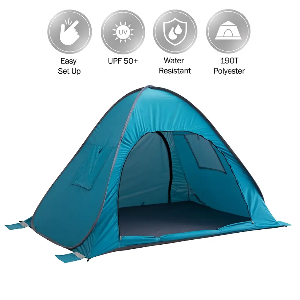 Make your outdoor adventure a memorable one by bringing along the Beach Tent Pop Up Shade by Wakeman. This beach cabana tent boasts a UV protection rating of UPF 50+, offers 2 mesh windows with rollable cover flaps for optimal ventilation, a zippered back door, 2 interior storage pockets, and features water repellent material. With instant set up that takes just seconds, this pop-up beach tent is ideal to provide shade and protection for outdoor sporting events, fishing, camping, a day at the park, or just relaxing in the backyard.