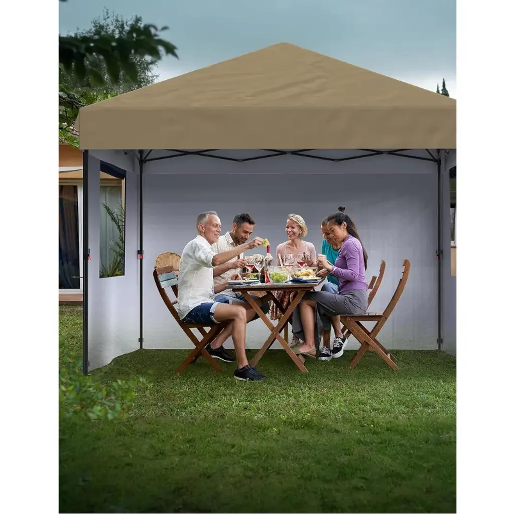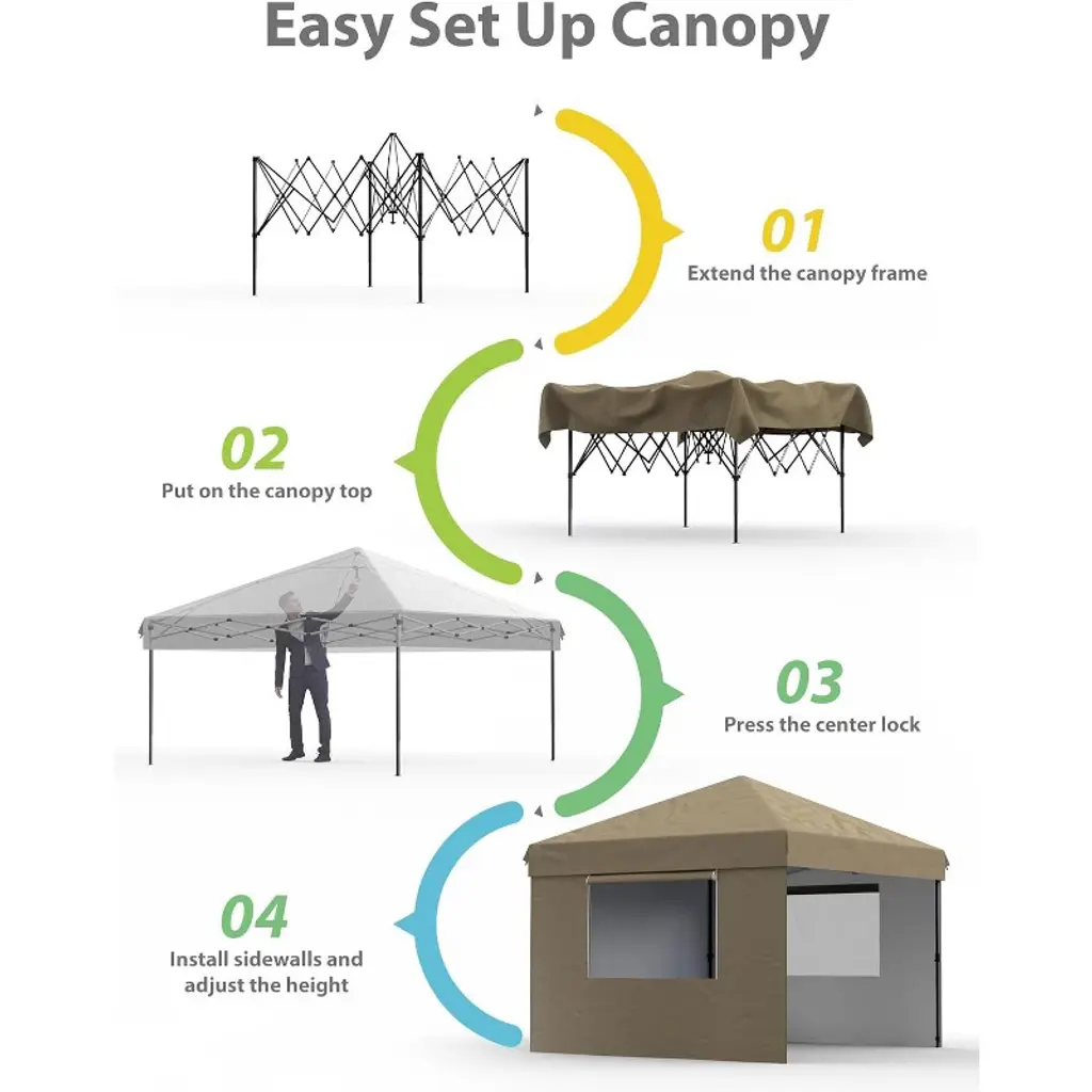 10'x20' Instant Pop-Up Canopy Tent - Quick One-Push Assembly Sun Shelter for Outdoor Events, Parties, Camping & Commercial Use, Includes 6 Removable Sidewalls, Portable Wheeled Carry Bag, With a sophisticated central locking system, this canopy tent opens and closes effortlessly. Just engage the lock—no tools needed—and assemble it in minutes. Three adjustable leg heights suit various scenarios. Six detachable sidewalls let you customize for privacy or weather protection, ensuring flexibility and functionality.