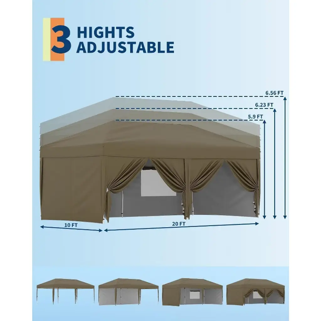 10'x20' Instant Pop-Up Canopy Tent - Quick One-Push Assembly Sun Shelter for Outdoor Events, Parties, Camping & Commercial Use, Includes 6 Removable Sidewalls, Portable Wheeled Carry Bag, With a sophisticated central locking system, this canopy tent opens and closes effortlessly. Just engage the lock—no tools needed—and assemble it in minutes. Three adjustable leg heights suit various scenarios. Six detachable sidewalls let you customize for privacy or weather protection, ensuring flexibility and functionality.