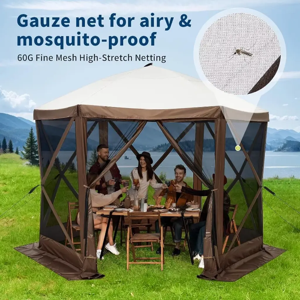 The camping gazebo is a versatile and practical outdoor solution. Constructed with 250D waterproof Oxford fabric and B3 insect mesh, it offers UV50+ sun protection, making it suitable for family camping, backyard gatherings, and various outdoor events. Its six-sided walls with 60G fine mesh provide ventilation and privacy, and it has an IPX3 water-resistant rating for rainy days. With a rapid 60-second pop-up assembly and a compact carry bag, it ensures easy portability for different outdoor activities. The all-season stability package, including a heavy-duty steel frame, stakes, and guy ropes, along with reinforced rainproof corners and a zipper door, guarantees reliability in various weather conditions. Moreover, its extra headroom makes it ideal for use as a camping canopy, market stall shelter, or BBQ gazebo, comfortably accommodating group activities in diverse outdoor settings.