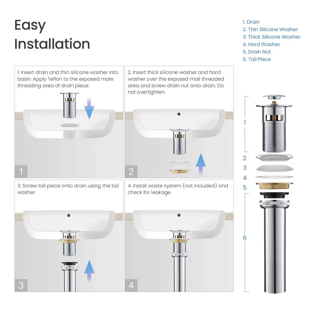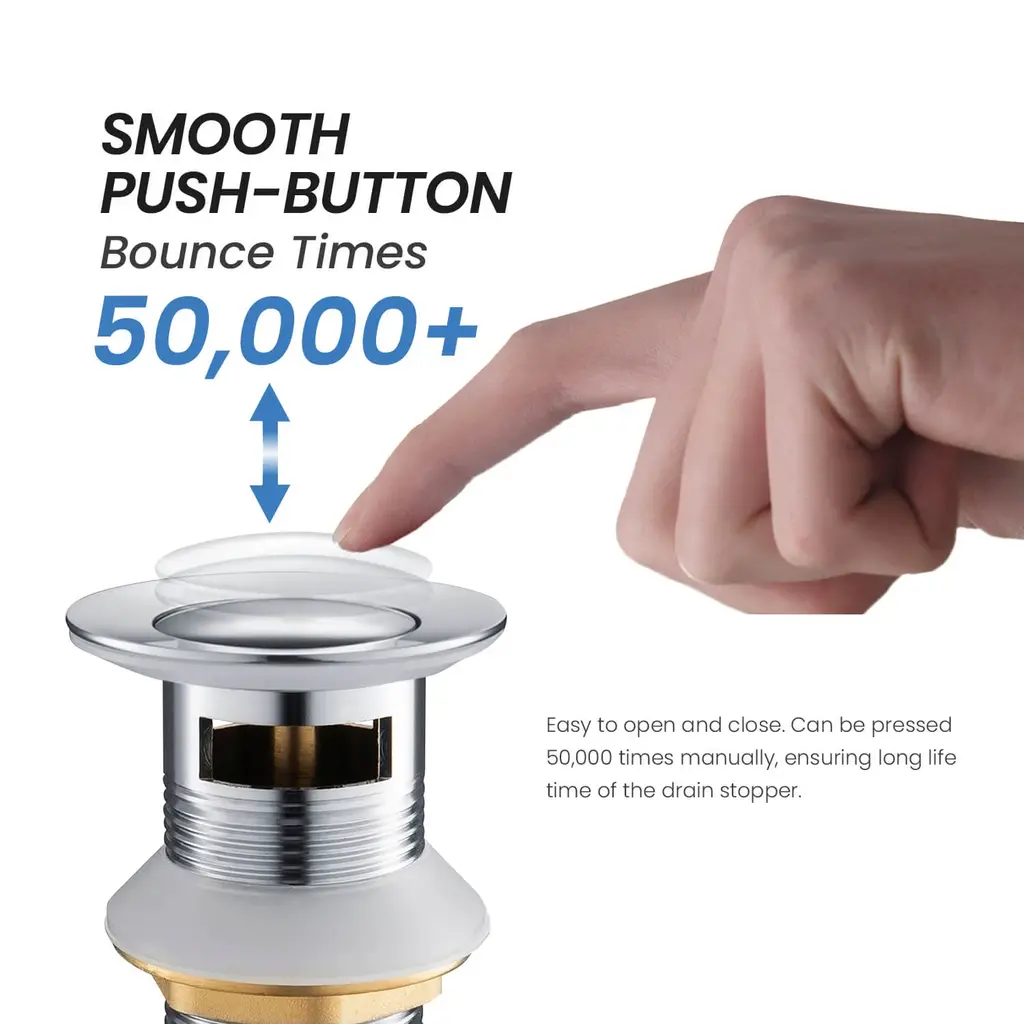 🏠 Standard 1-3/4" drain opening: fits sink hole diameter 1-5/8" to 2-5/16". max sink thickness 2".🏠 Ideal for any sink with an overflow hole.🏠 Guaranteed 50,000 smooth bounce times.🏠 The sturdy brass metal structure ensures corrosion resistance, rust prevention, and maximum durability.🏠 Four layers of superior finishes surpass industry durability standards, will not fade over time.🏠 Easy to install: drain, thin rubber washer, thick rubber washer, hard washer, drain nut, the tail piece are all included. please follow the installation guide to ensure no leak.🏠 Limited lifetime warranty for all mechanical parts, 5 years warranty for finishes.