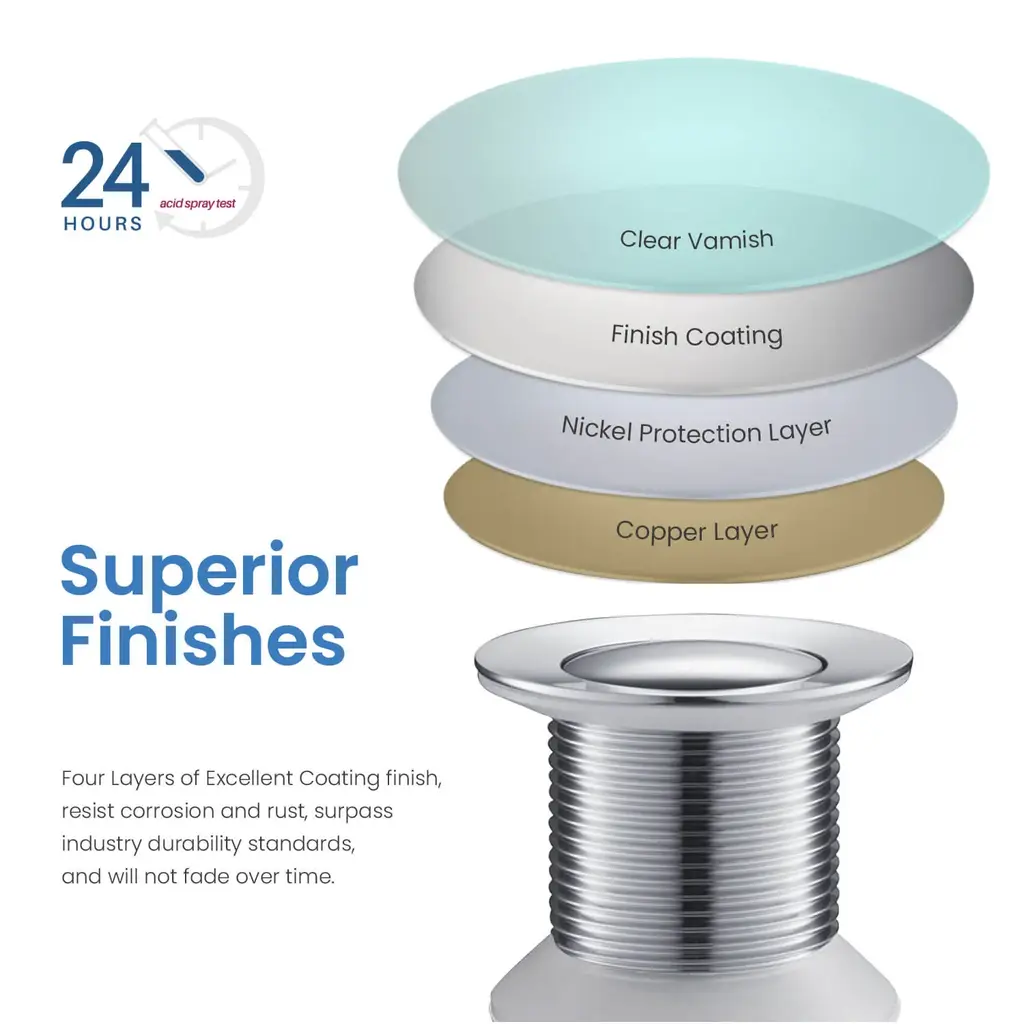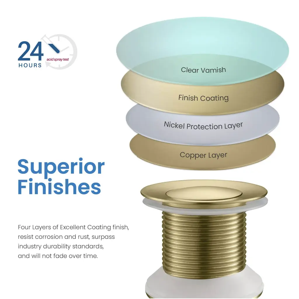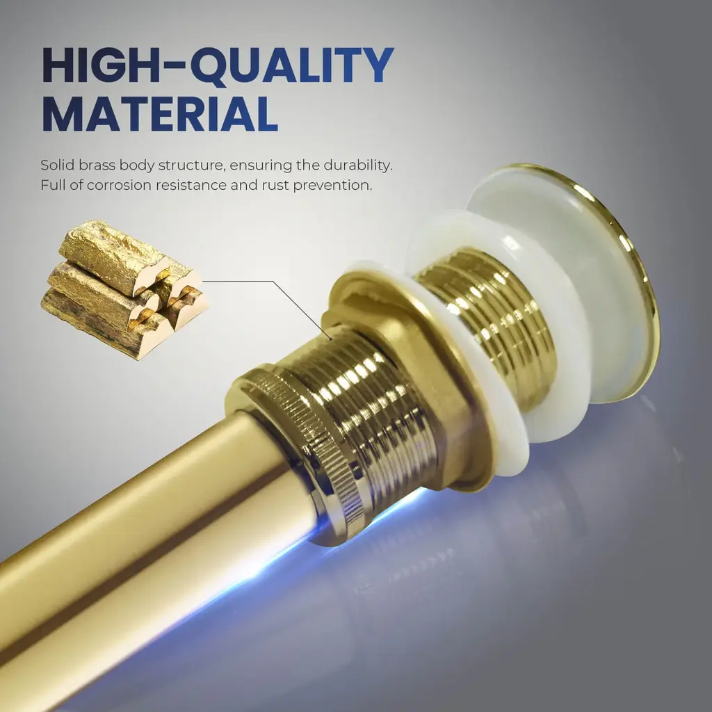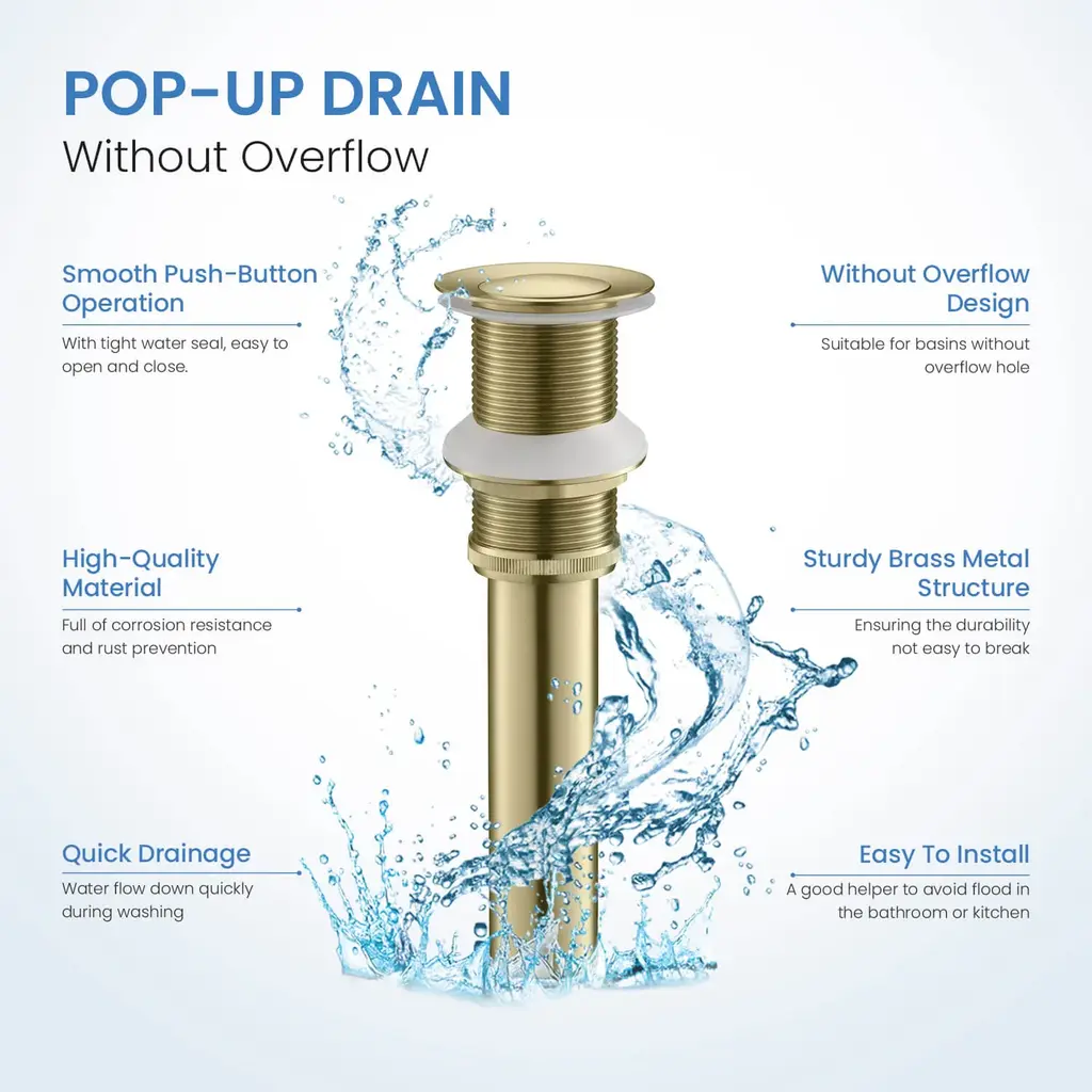 🏠Standard 1-3/4" drain opening: fits sink hole diameter 1-5/8" to 2-5/16". max sink thickness 2".🏠Ideal for any above-counter vessel sink without an overflow hole.🏠Guaranteed 50,000 smooth bounce times.🏠The sturdy brass metal structure ensures corrosion resistance, rust prevention, and maximum durability.🏠Four layers of superior finishes surpass industry durability standards, will not fade over time.🏠Easy to install: drain, thin rubber washer, thick rubber washer, hard washer, drain nut, the tail piece are all included. please follow the installation guide to ensure no leak.🏠Limited lifetime warranty for all mechanical parts, 5 years warranty for finishes.