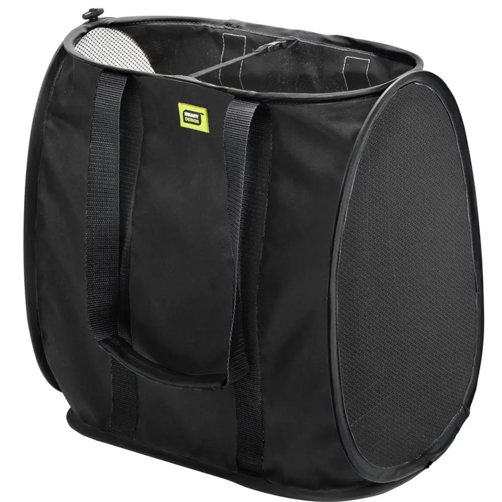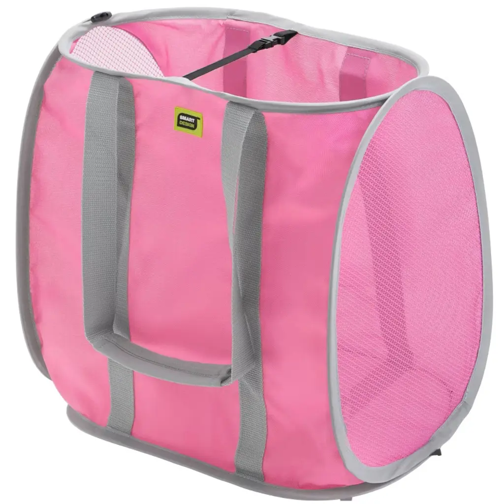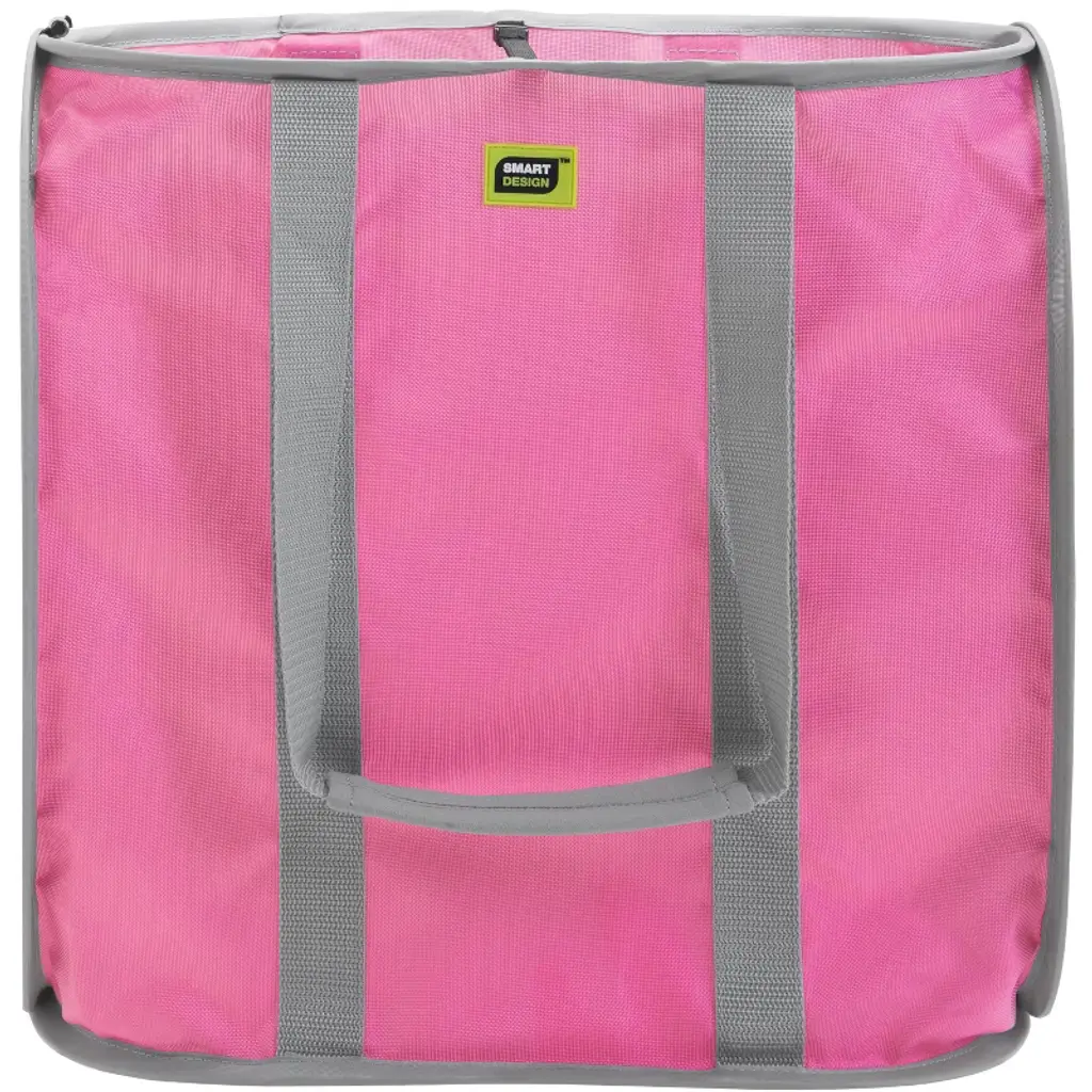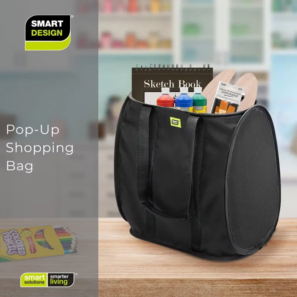 Smart Design Pop Up Shopping Bags Pack groceries, baby items, & more inside the Pop Up Shopping Bag, pull the elastic strap, lock the clasp, and get going! Your items will remain safe, secure, and protected in the car or while shopping or on the move w/ the tension loop steel frame keeping the bag upright. Package Includes Large Pop Up Shopping Bag design folds flat when not in use for maximum storage-saving space. The durable design & reinforced bottom holds multiple items w/ ease & open top allows for instant loading & unloading. Features & Benefits Pop Up Shopping Bags are reusable and have durable padded handles for easy portability and travel. Keeps your items safe and protected with the elastic strap & clasp lock to hold items in place in moving vehicles or while carrying. Product Specifications Dimensions: 15(L) x 10(W) x 15(H) inches Bag Size: Large Color: Navy w/ Gray Trim Material: Heavy Duty Polyester Design: Pop Up w/ Tension Loop Steel Frame Holds: Groceries, Baby Items, & Storage