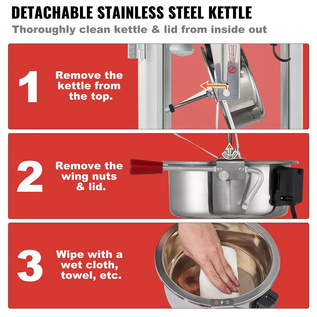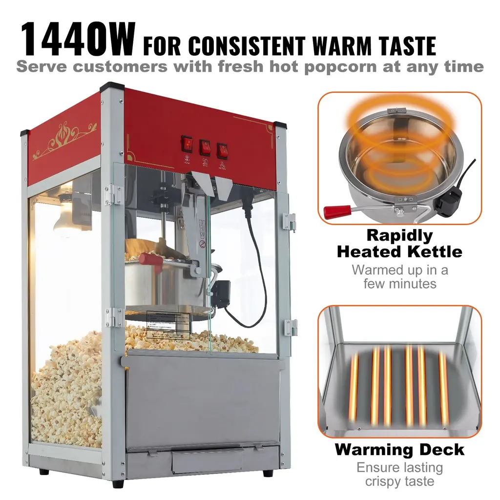 High Output with Powerful Performance: This commercial popcorn machine has a power of 850W and an 8 oz capacity( for 48 cups option )/1440W and a 12 oz capacity( for 80 cups option ), capable of producing 48 cups/80 cups of popcorn (approximately 384 ounces/640 ounces) per batch, meeting the demands of busy convenience stores. The kettle preheats in just a few minutes, ready to satisfy sports fans, festival goers, and party guests with plenty to eat. Easy Operation, Long-Lasting Warmth: Three excellent switches control the entire countertop popcorn machine: warmer, stirrer, and kettle heater. This simplifies operation, making it easy for any staff to use. The warming tray below is equipped with a 50W heating element and a 60W warming light that brightly illuminates your popcorn. The finished popcorn falls onto the warming tray to stay fresh, with the light making them sparkle, attracting everyone's attention! Durable Structure, Easy to Clean: This movie theater style popcorn machine is made of a cold-rolled plate frame and tempered glass panels, designed for frequent use. The door with a magnetic latch allows for quick access and enhances the presentation of the popcorn inside. The printed graphics on top may also attract some hungry eyes. Additionally, the wing nut on the kettle allows for easy removal of the lid for thorough cleaning. Easy cleaning will extend the machine's lifespan. User-Friendly Design: Once the heating tray starts to fill up, simply open the hinged cover below, and the popcorn is right there, ready to scoop out! The removable crumb tray keeps the interior clean, with no scattered kernels. Collecting and disposing of dropped kernels has never been so simple! Awesome Accessories: This industrial popcorn machine includes plastic components: corn scoop x1, oil scoop x1, seasoning scoop x1, and popcorn spatula x1 (aluminum). You will truly enjoy the fun of making delicious popcorn. The complete accessories make it ready to use right out of the box, making operation a breeze. It's time to enjoy batch after batch of fresh popcorn! Package Content 1 x Popcorn Popper Machine 1 x Set of Accessories