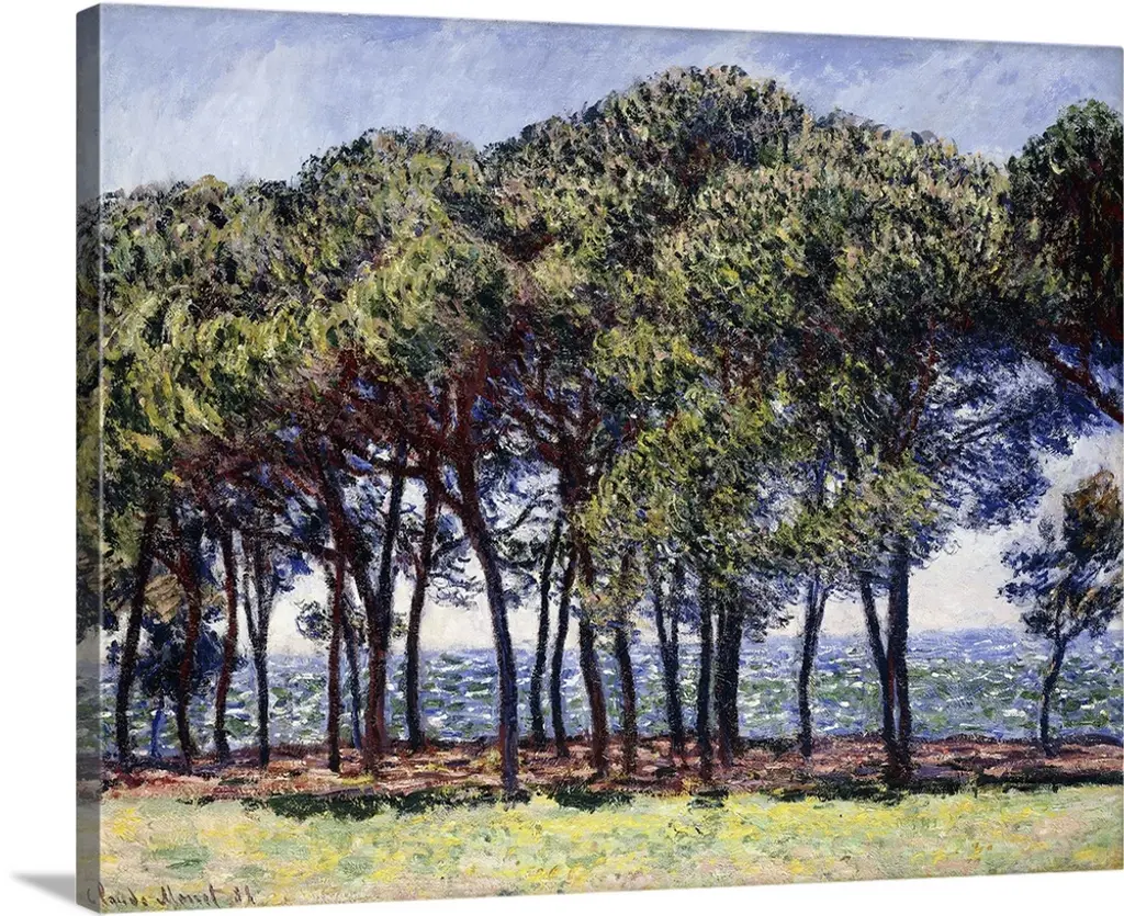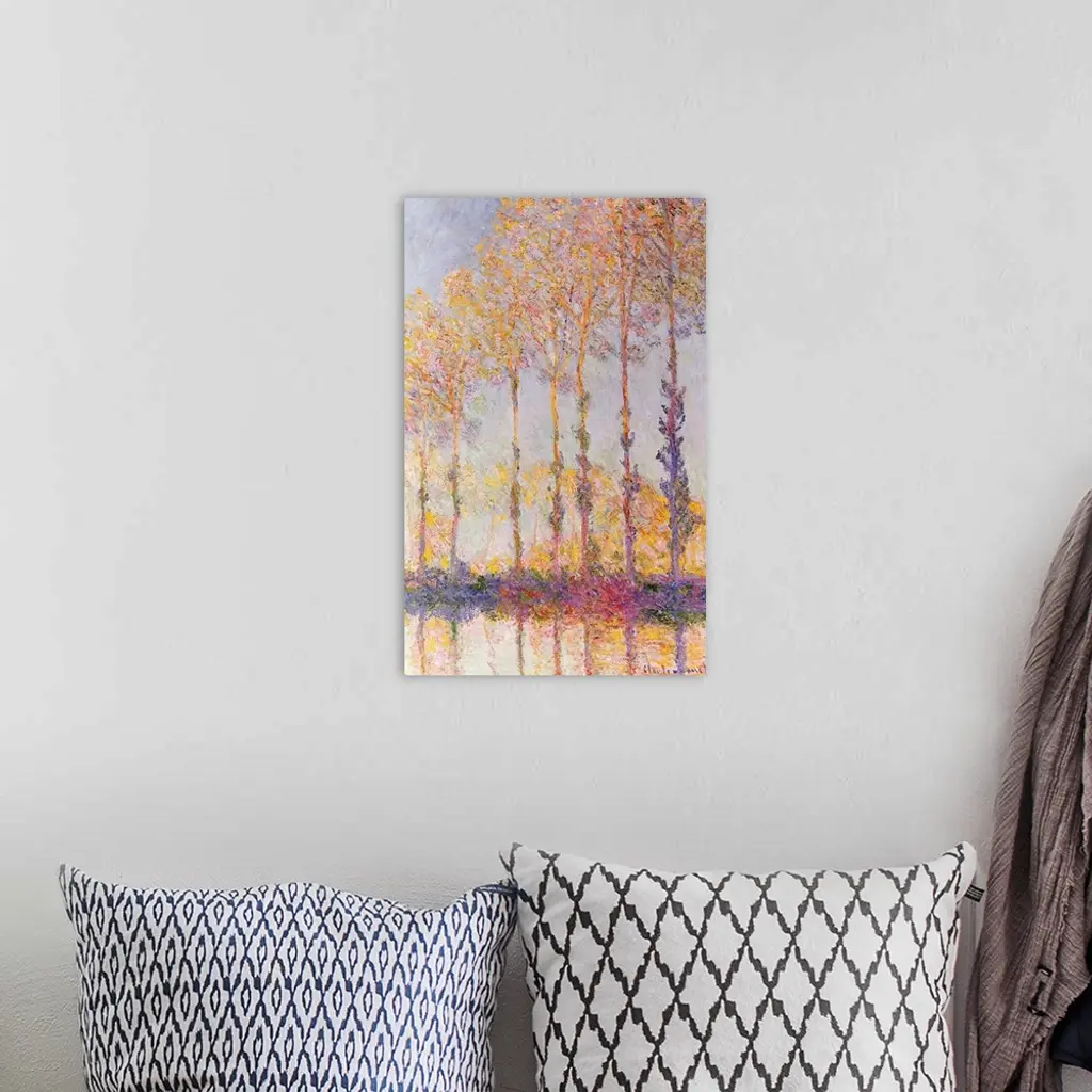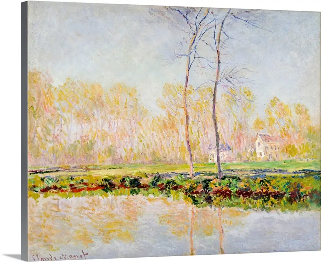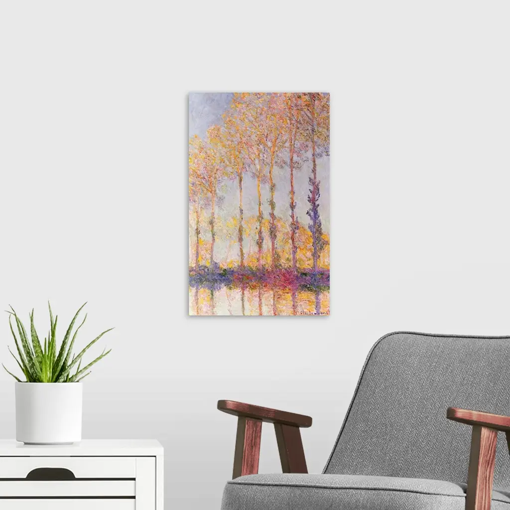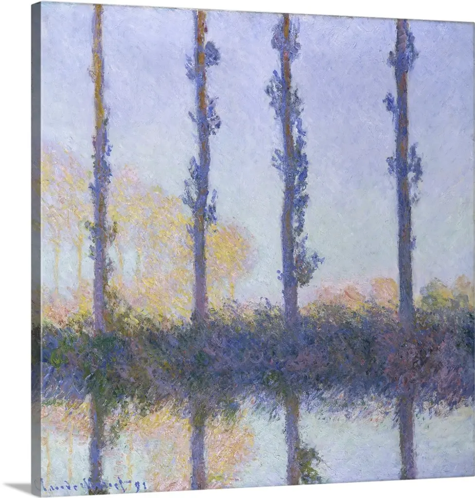 This Impressionist vertical panting makes use of a pastel color palette to capture the fading daylight on a row of trees growing on a river bank and reflecting in the still waters.