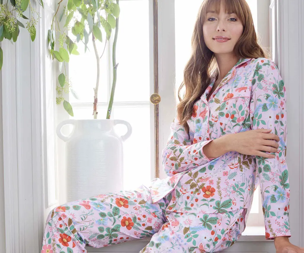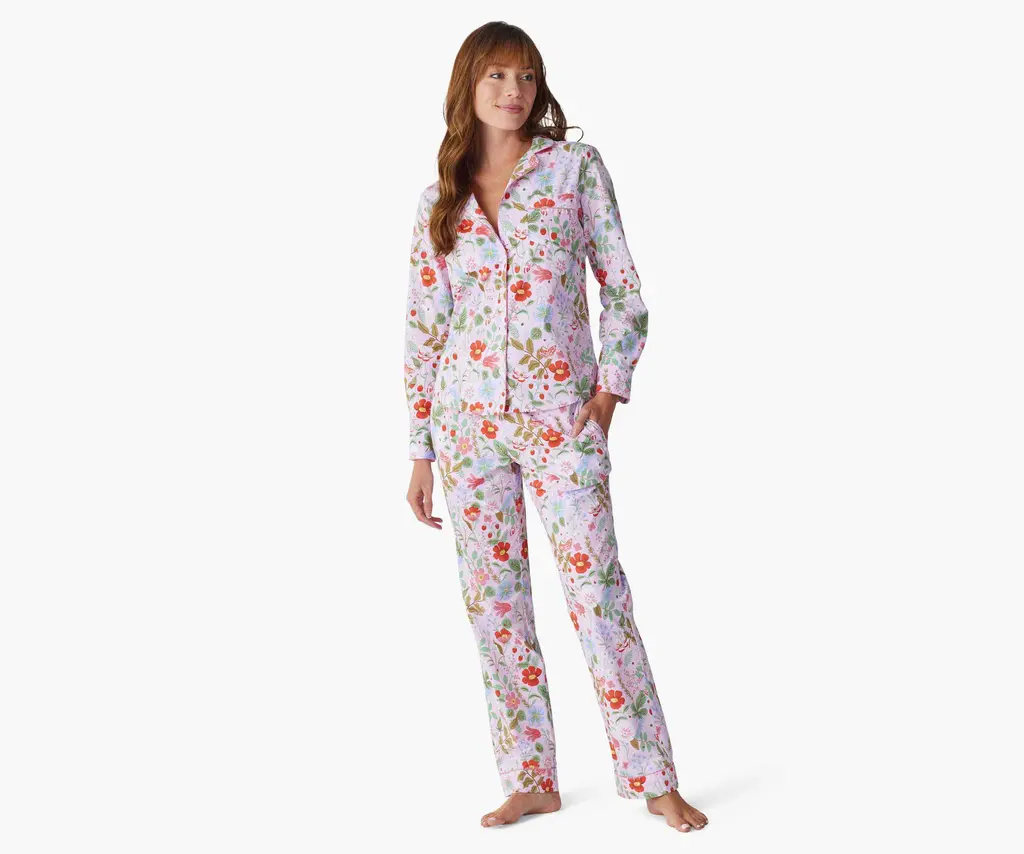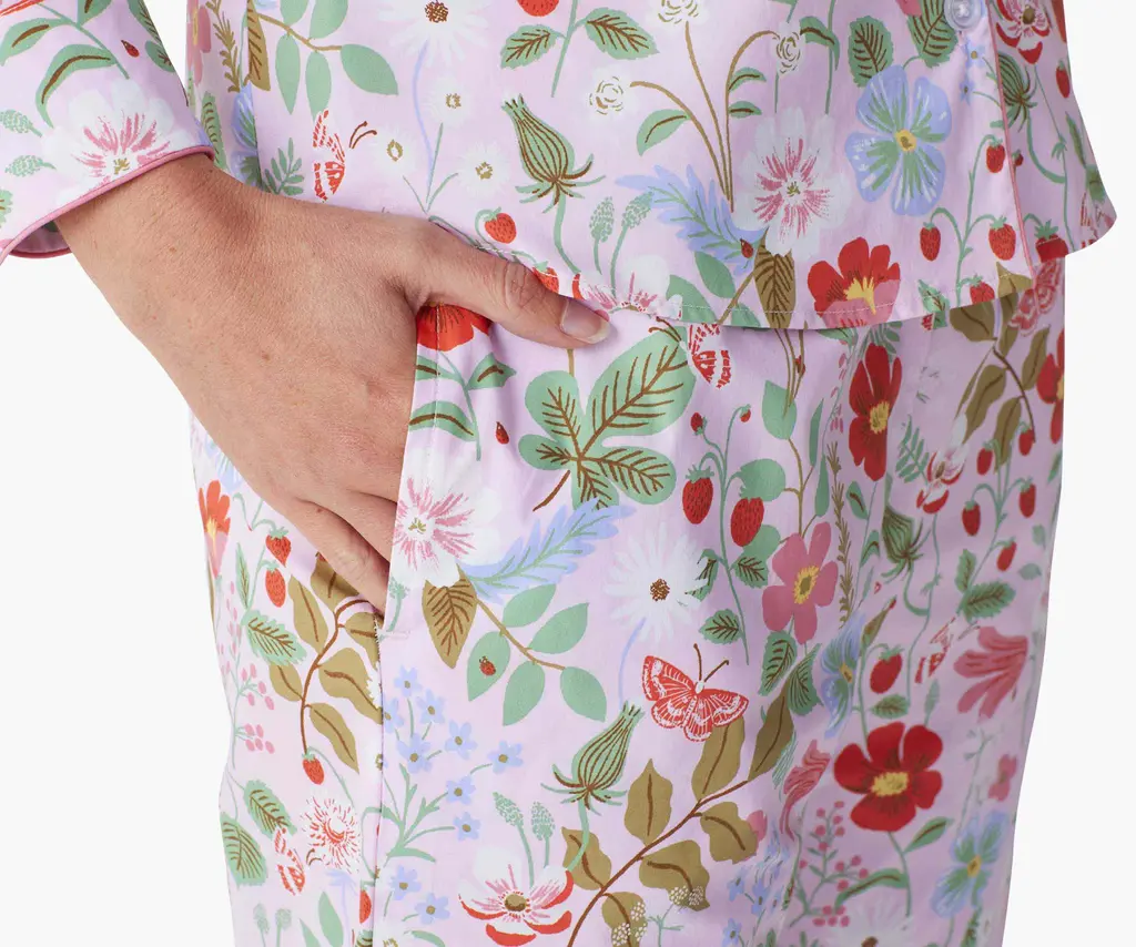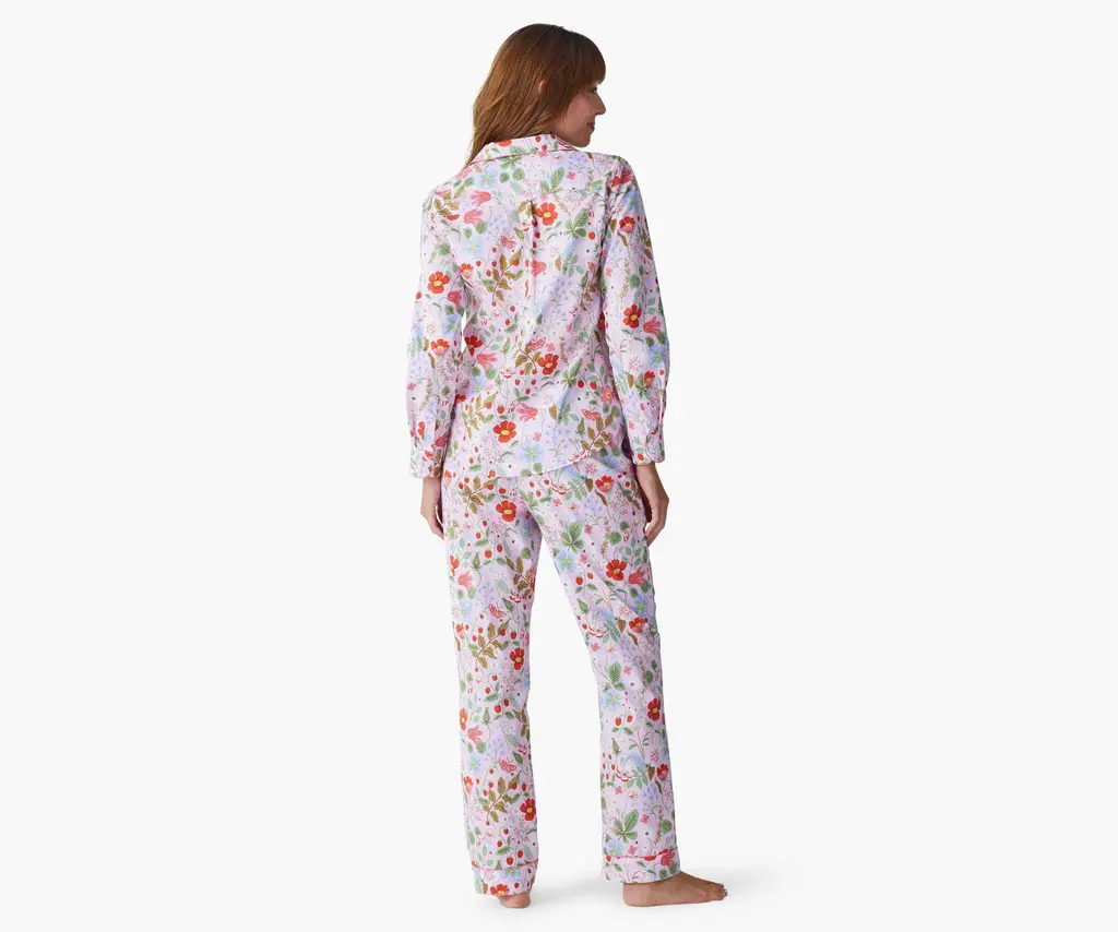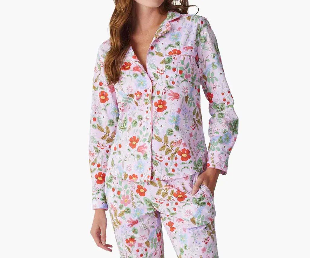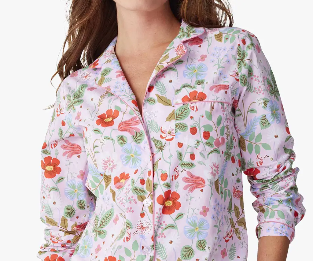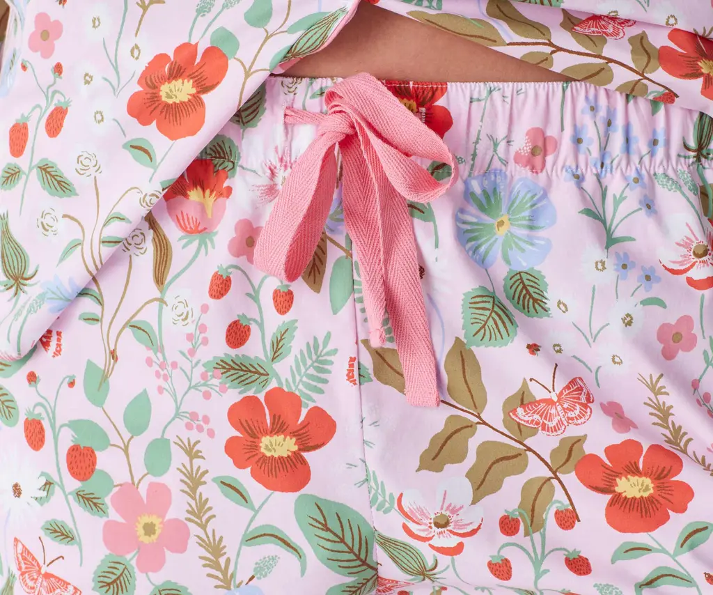 Relax in this pajama set featuring our Strawberry Fields print in a sweet pink colorway. The classic top features a button-down design, a notch collar, and piping trim. The pants are made extra-comfy with an elastic waist, twill tape ties, and pockets. While the collection fits true to size, we recommend using the fit guide as a reference.