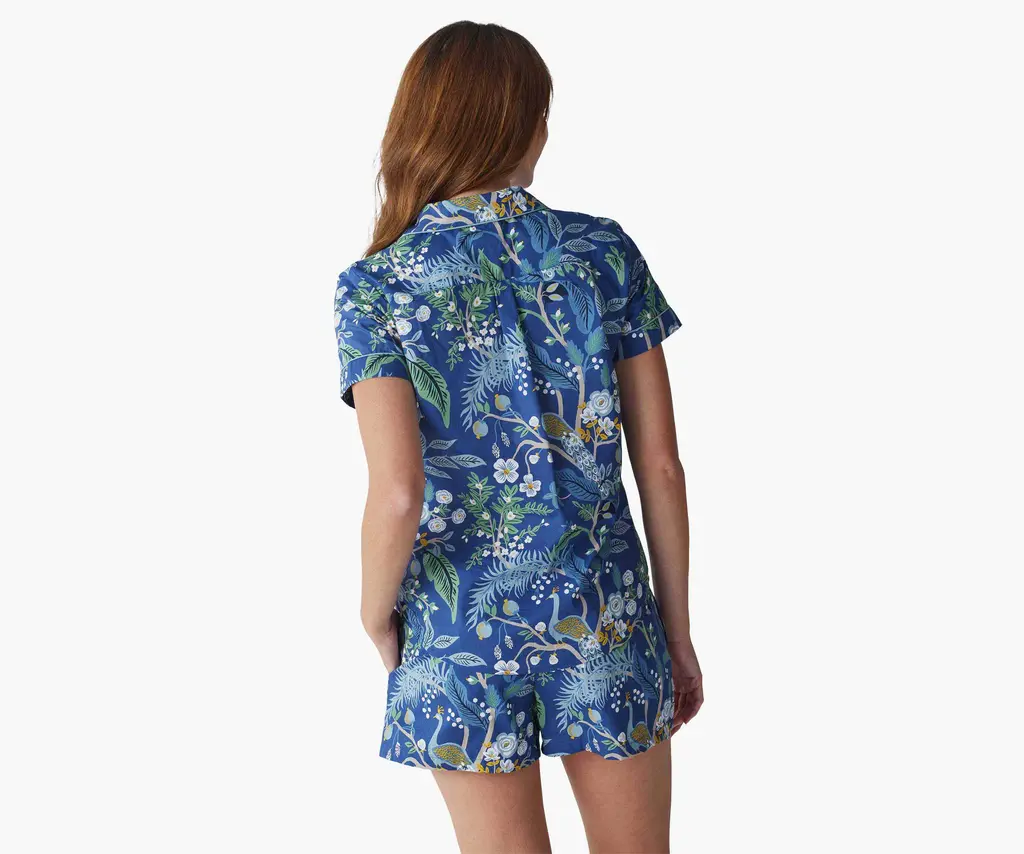 Relax in this pajama short set featuring our Peacock print in a cool blue colorway. The classic top features a button-down design, a notch collar, and piping trim. The shorts are made extra-comfy with an elastic waist, twill tape ties, and pockets. While the collection fits true to size, we recommend using the fit guide as a reference.