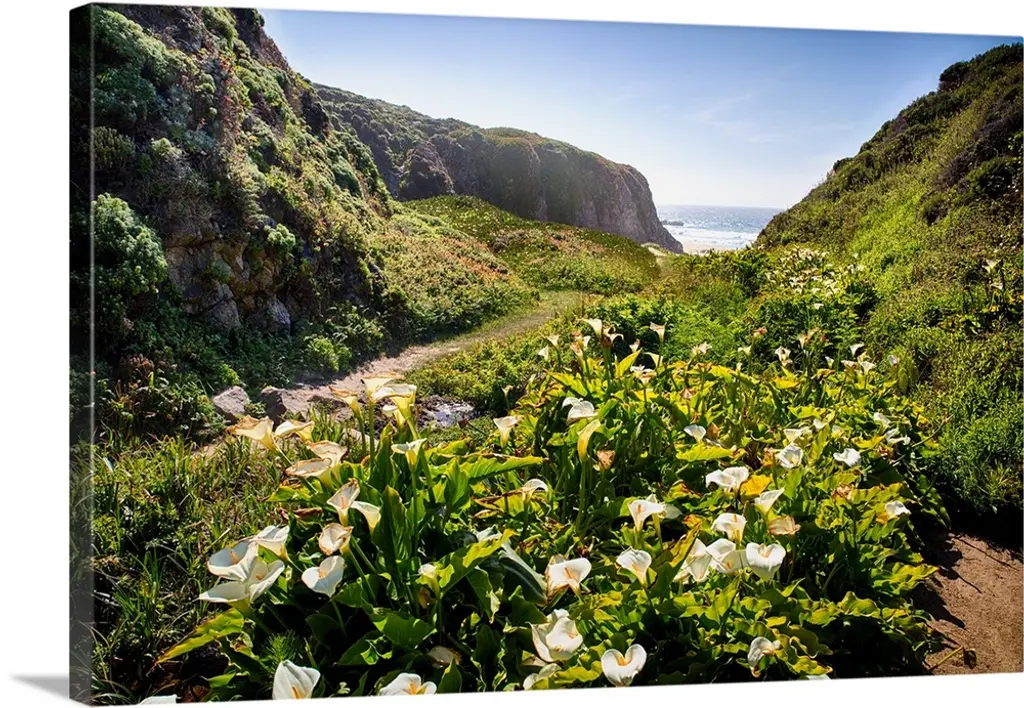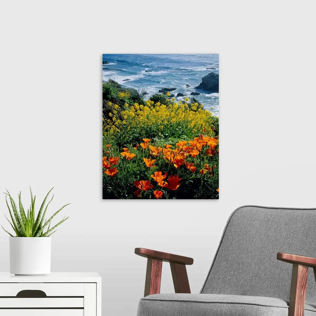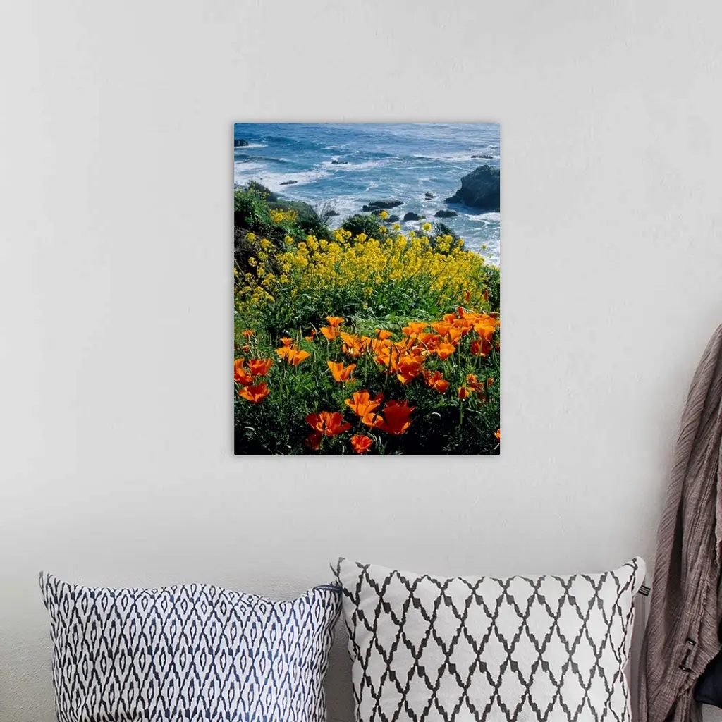 Vertical photograph of florals growing on the top of a cliff overlooking the sea.