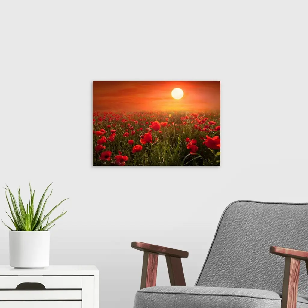 Fine art photograph of a field of red poppies under the setting sun.