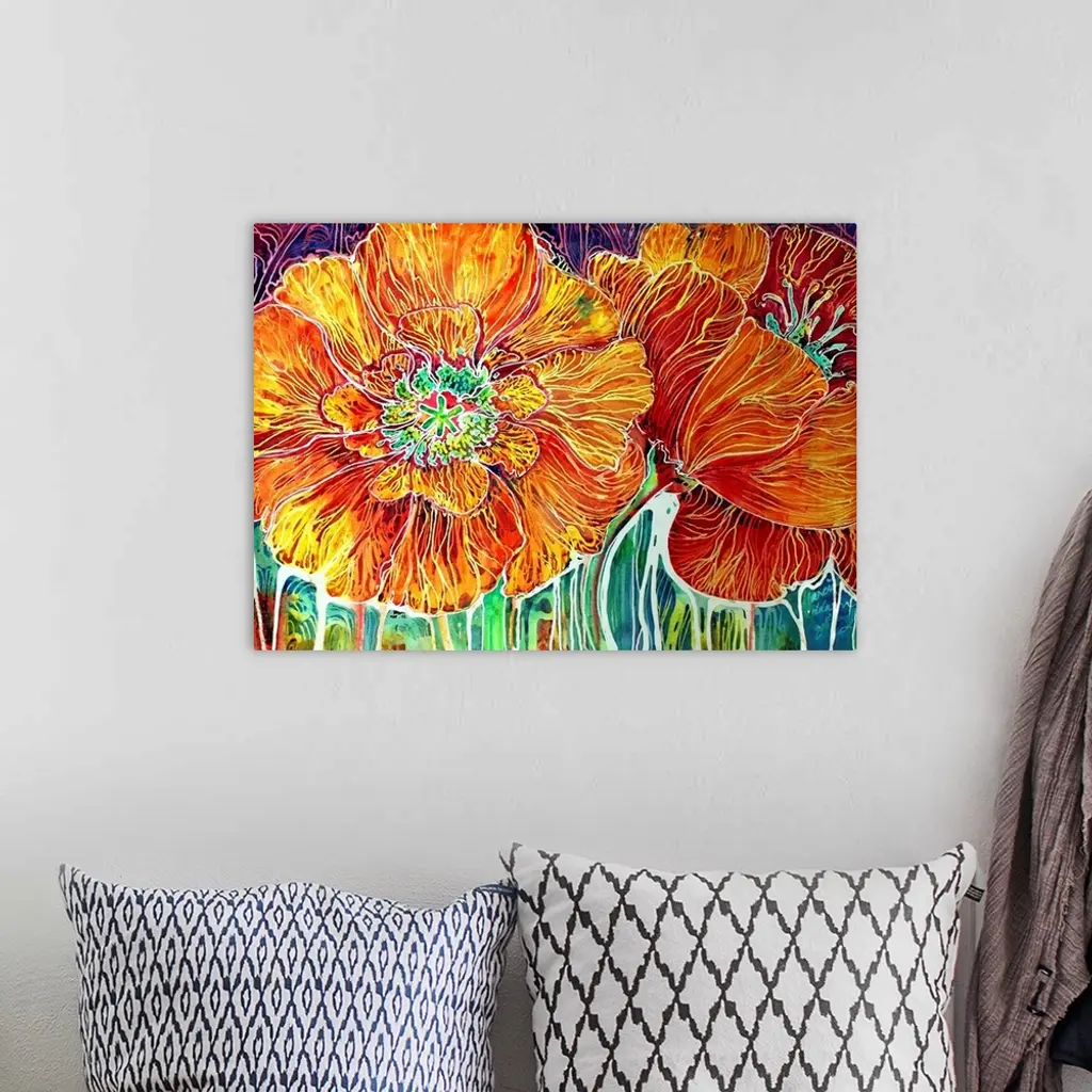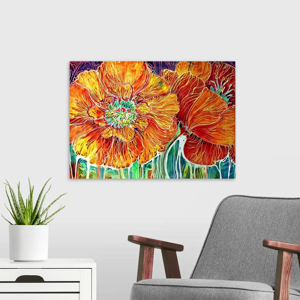California wild poppies, captured on canvas using the exciting technique of Batik and watercolor.
