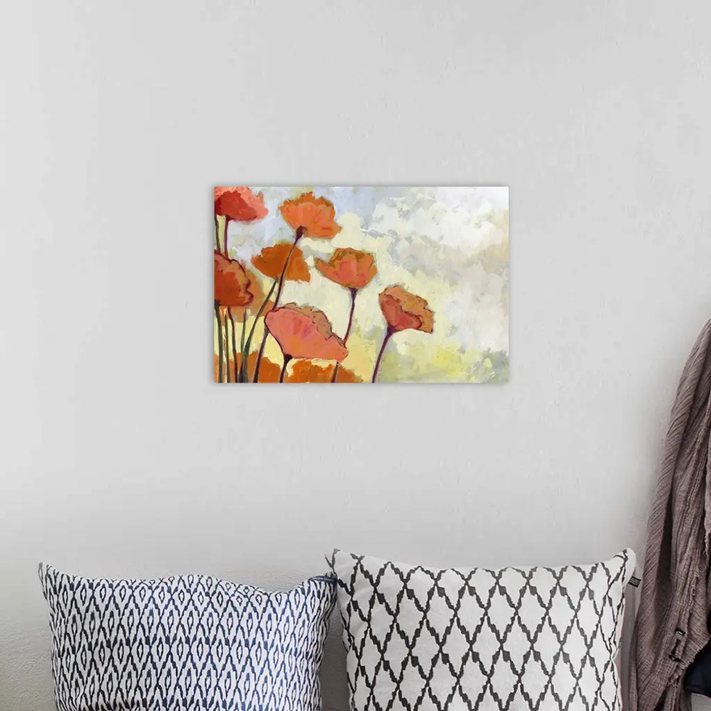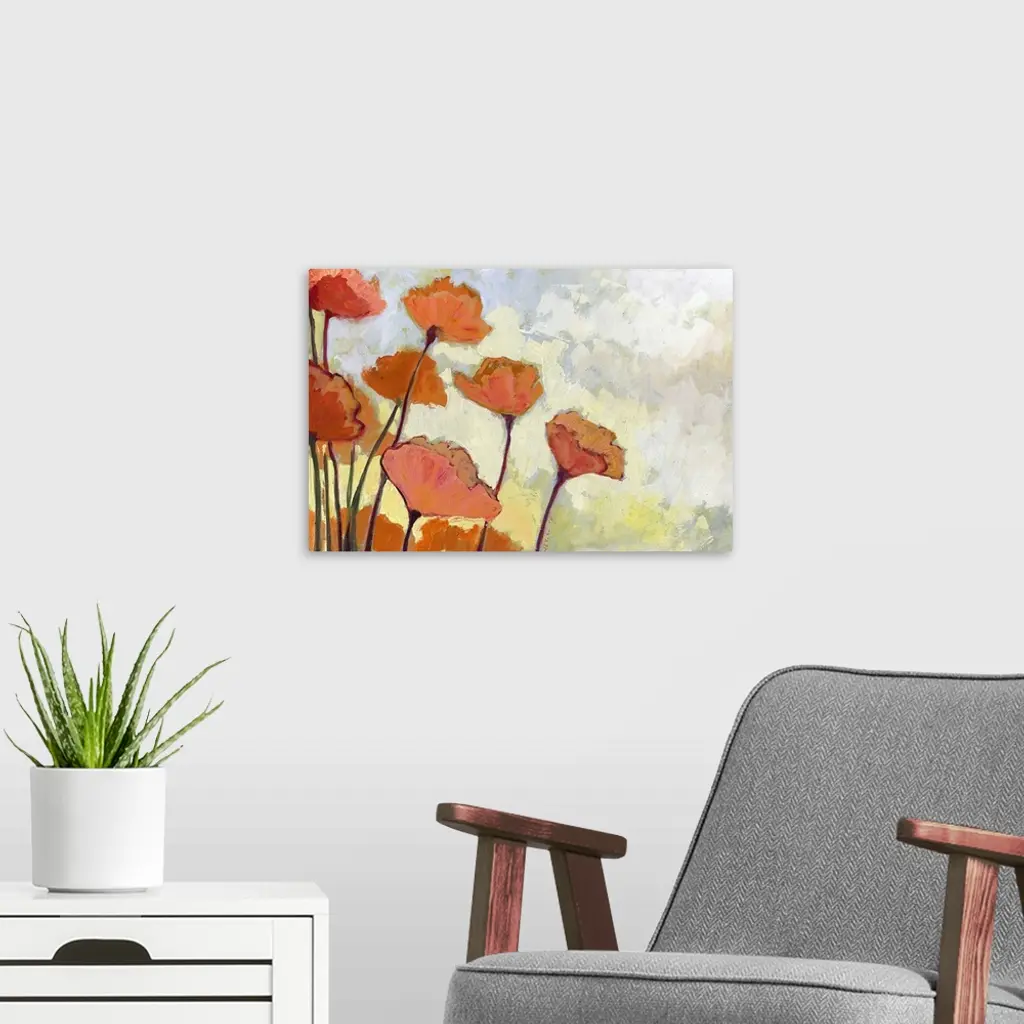 Orange and peach colored flowers are painted against a soft yellowish background.