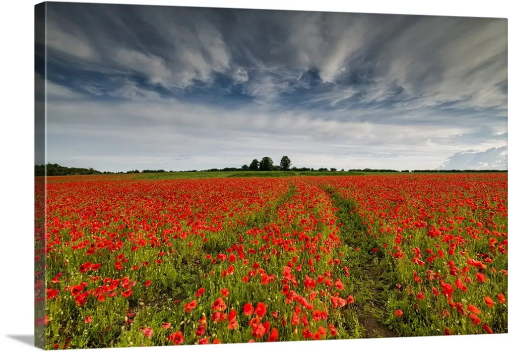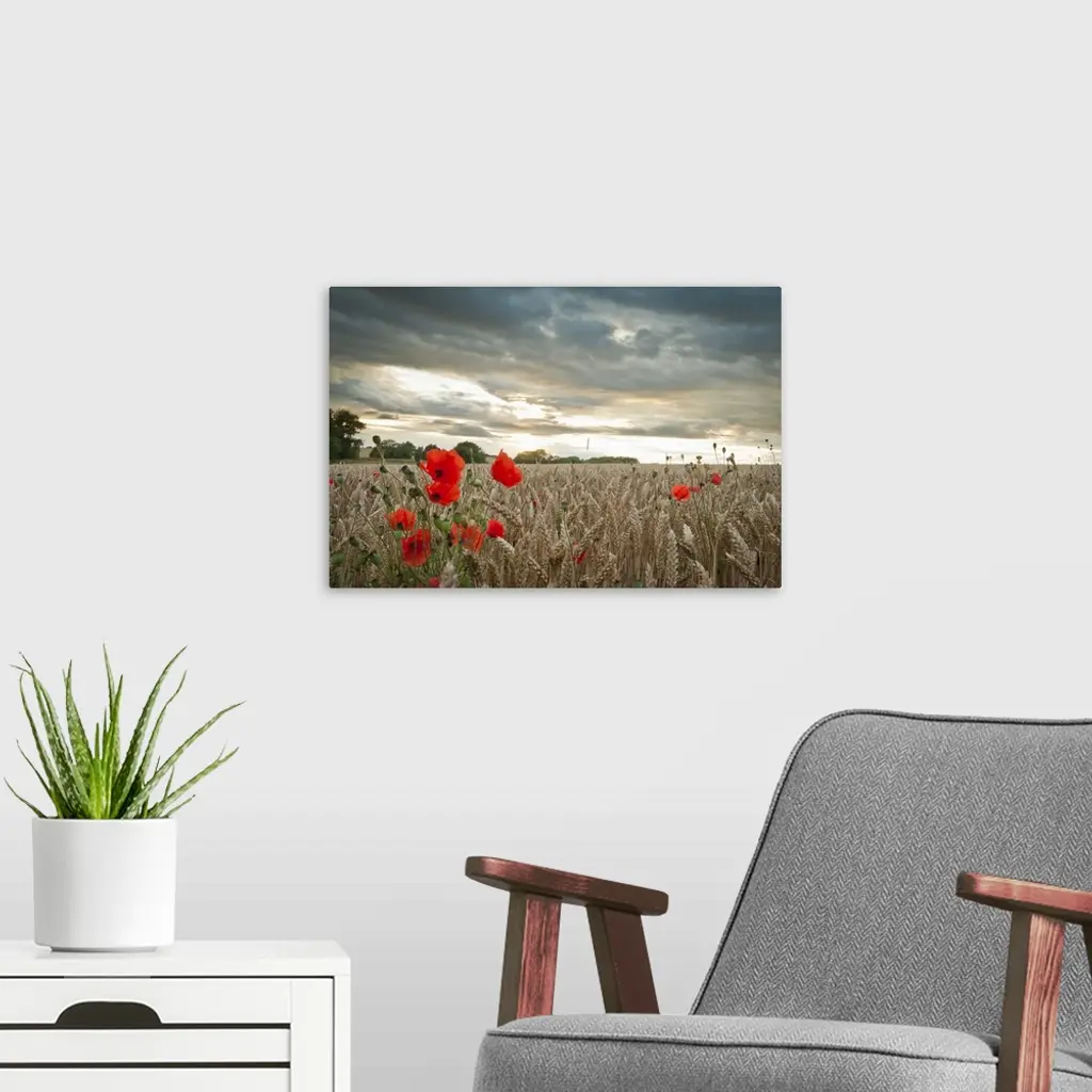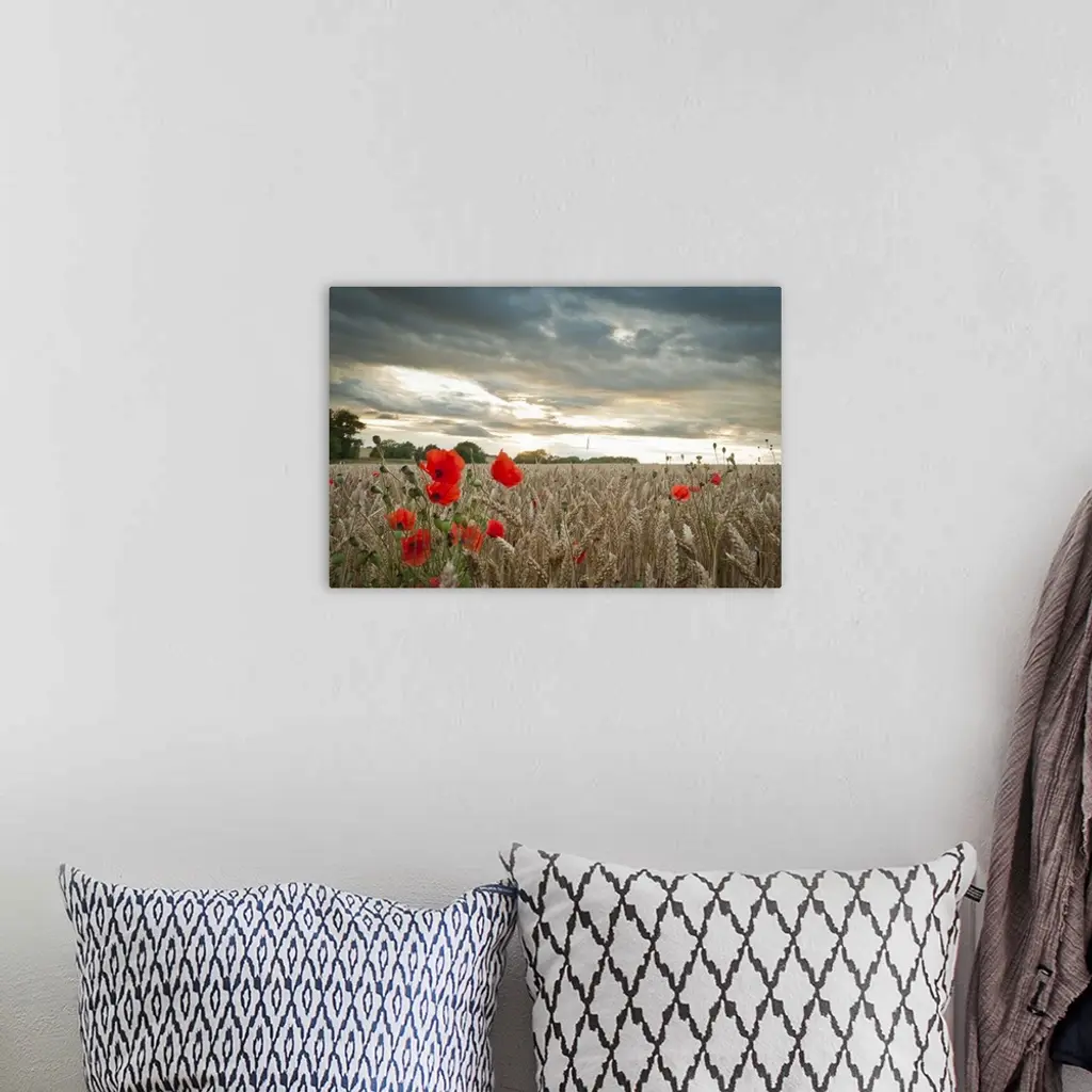 Red poppies in wheat/barley field under moody dramatic sunset with dark clouds.