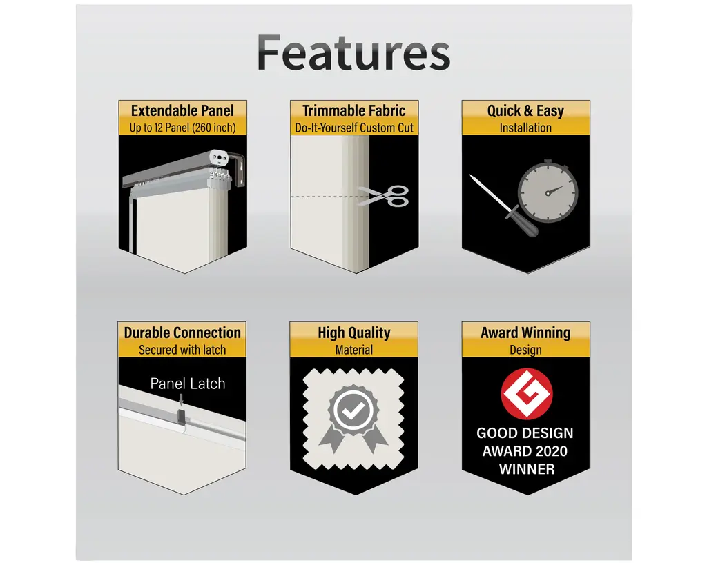 Central Design Products is pleased to introduce a new innovative panel track that offers easy 2-way installation, adding an alluring style and refined touch to your home decor. The single rail design of the track is sleek, compact, and reduces the overall footprint and weight of the installation, eliminating bulky, intrusive window treatments. Adjusting the panel height is a breeze � simply trim the panel, re-attach the liner, and install the panel weight. Detailed instructions are included.The panel track also features a patented slider design, made with aluminum and fitted with bearings that allow for durable and smooth operation. The sliders are stacked closer together than conventional panel tracks, reducing light bleed coming from the gaps between panels. This track has endless uses from dividing rooms, garages, offices, and closets to decorating windows and patios. Available in larger sizes including 8, 10, and 12 panels.Extends from 48-88� wide.Each panel measures 23.5" wide and 91.5" tall, with a total installation height of 94" (includes the 2.5" rail track).The track can be wall or ceiling mounted.The panels can stack on the left or the right.The clearance from the wall is extendable from 1.25� to 3.25� and projection from the wall is extendable from 3� to 4.25�.Poppy panel is made from 100% Polyester, with a light filtering shade that blocks 70% of the light.