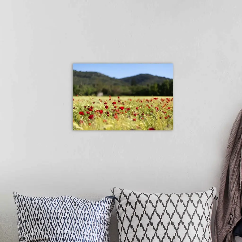 A rural field with blooming poppies in the wind with Provencal hills background.