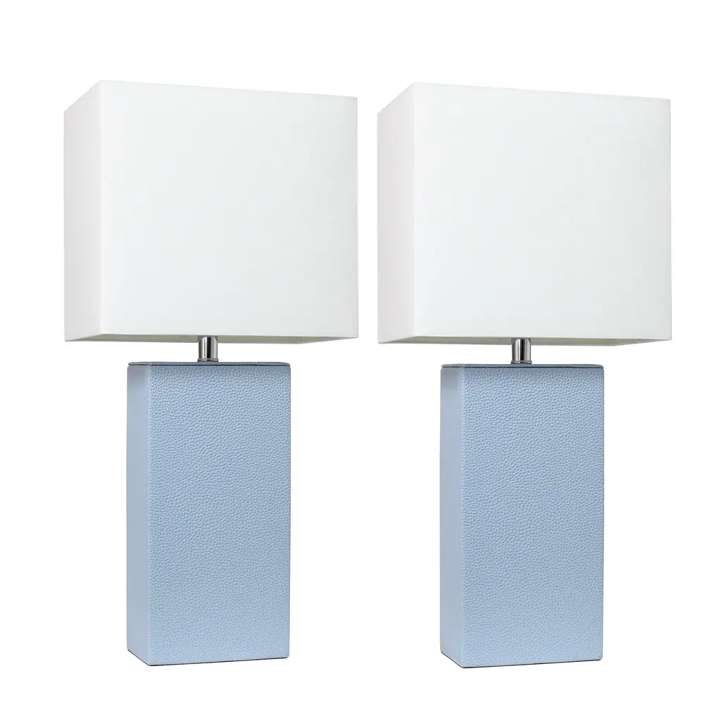 Enhance your living room decor with this pair of fashionable leather table lamps. Featuring a leather base available in a variety of colors, these lamps are nicely set off with neutral white fabric shades. The color contrast allows you to pick the perfect combination for your decor.