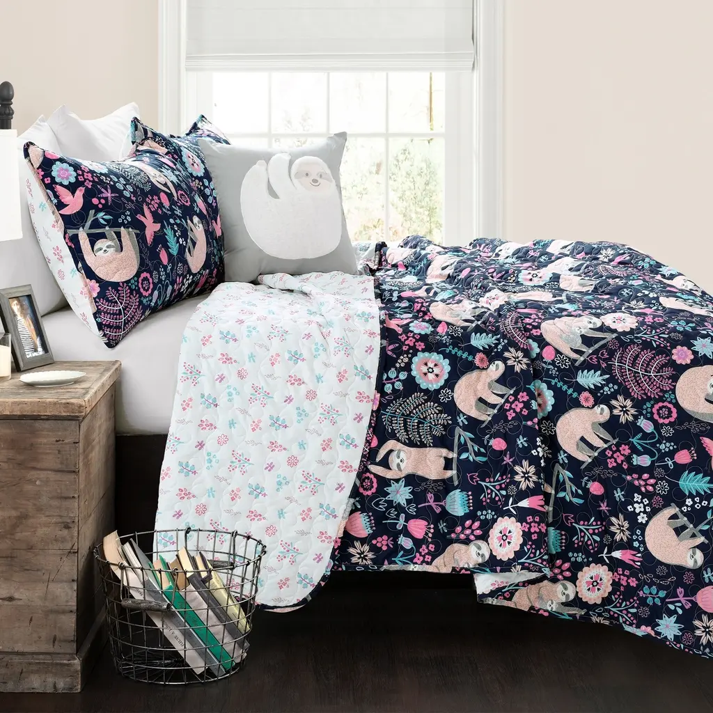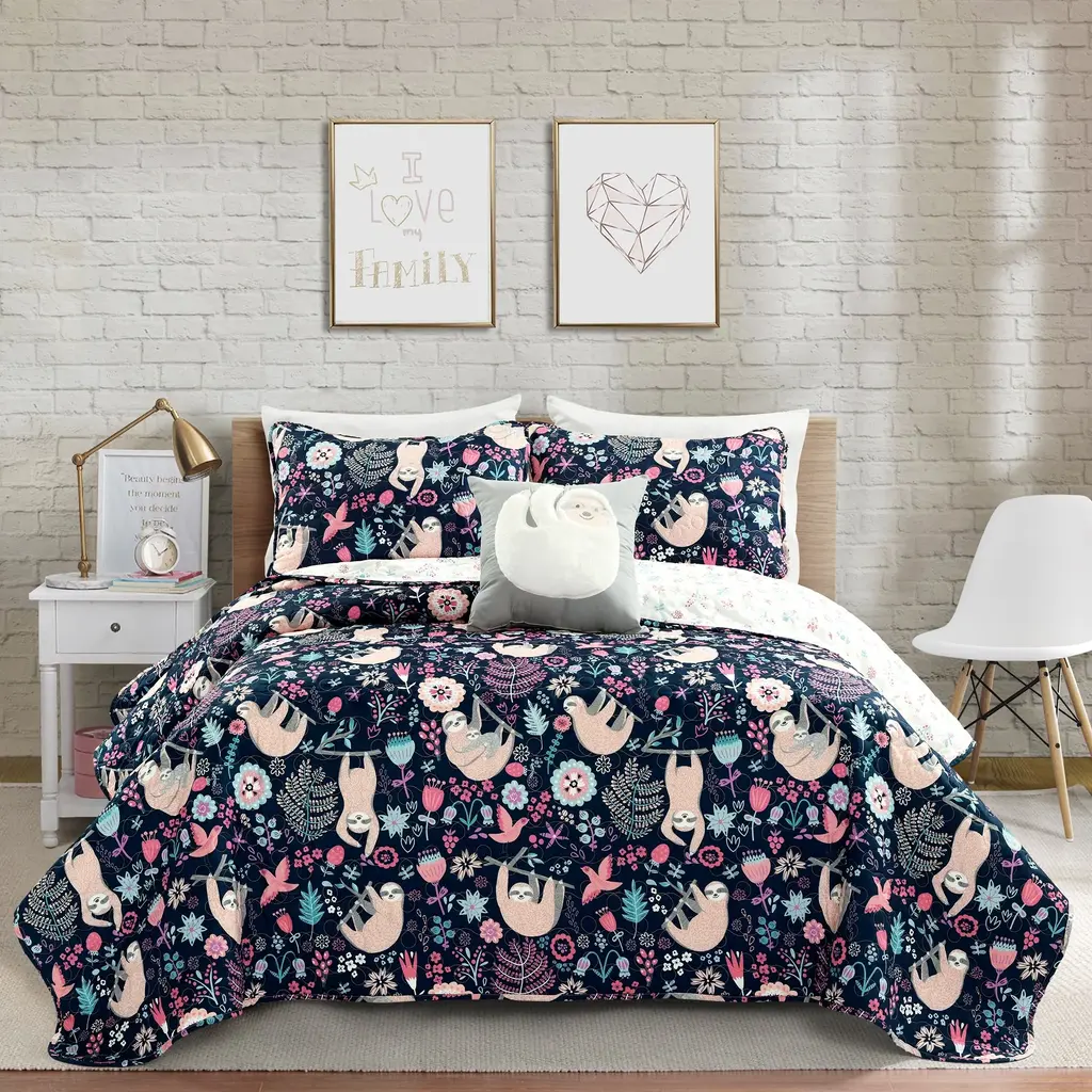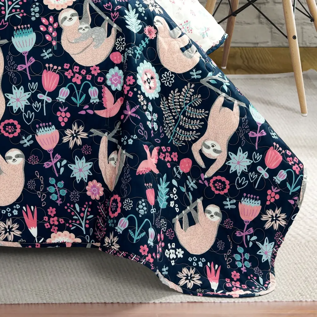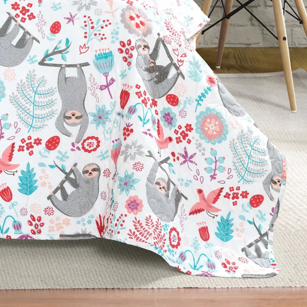 Update your childs bedroom with this adorable reversible quilt set featuring sloths, birds, flowers and more printed on the front, and a more subdued pattern of little flowers on the back. This set will truly bring your child's imagination to life!Features:Fabric Content 100% PolyesterFill Content 50% Cotton, 50% PolyesterReversibleMachine Wash Cold, With Similar Colors, Gentle Cycle. Use Only Non-Chlorine Bleach When Needed.Tumble Dry Low, Light Iron If Needed.3-Piece Twin Set Includes: 1 Quilt: 86 inches long x 68 inches wide 1 Sham: 20 inches long x 26 inches wide 1 Decorative Pillow: 16 inches x 16 inches4-Piece Full/Queen Set Includes: 1 Quilt: 92 inches long x 88 inches wide 2 Shams: 20 inches long x 26 inches wide 1 Decorative Pillow: 16 inches x 16 inches