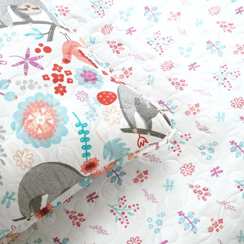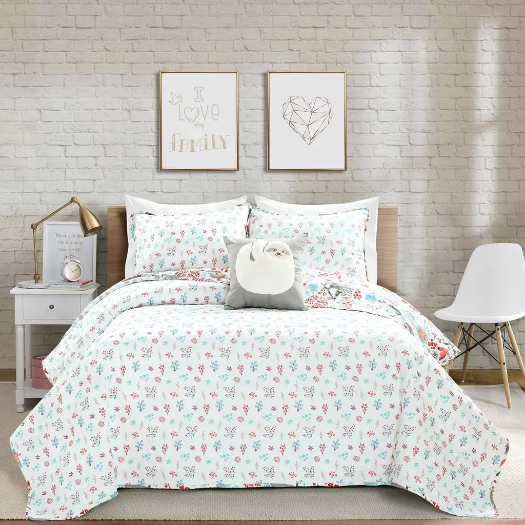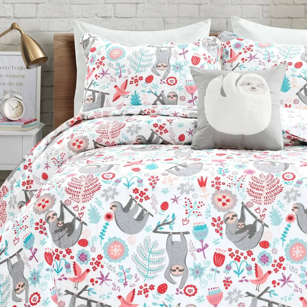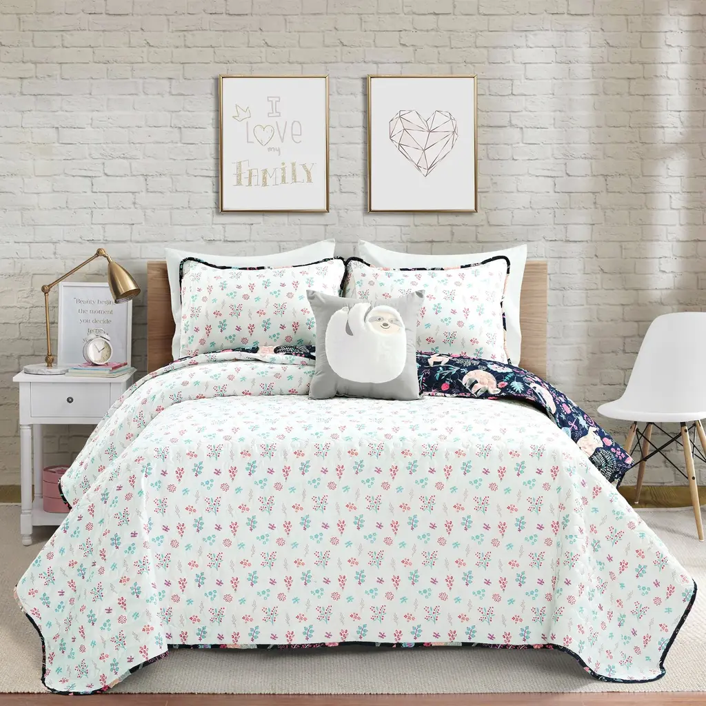 Update your childs bedroom with this adorable reversible quilt set featuring sloths, birds, flowers and more printed on the front, and a more subdued pattern of little flowers on the back. This set will truly bring your child's imagination to life!Features:Fabric Content 100% PolyesterFill Content 50% Cotton, 50% PolyesterReversibleMachine Wash Cold, With Similar Colors, Gentle Cycle. Use Only Non-Chlorine Bleach When Needed.Tumble Dry Low, Light Iron If Needed.3-Piece Twin Set Includes: 1 Quilt: 86 inches long x 68 inches wide 1 Sham: 20 inches long x 26 inches wide 1 Decorative Pillow: 16 inches x 16 inches4-Piece Full/Queen Set Includes: 1 Quilt: 92 inches long x 88 inches wide 2 Shams: 20 inches long x 26 inches wide 1 Decorative Pillow: 16 inches x 16 inches