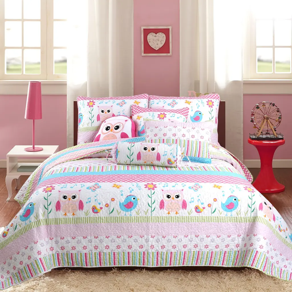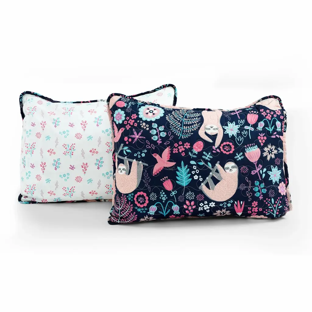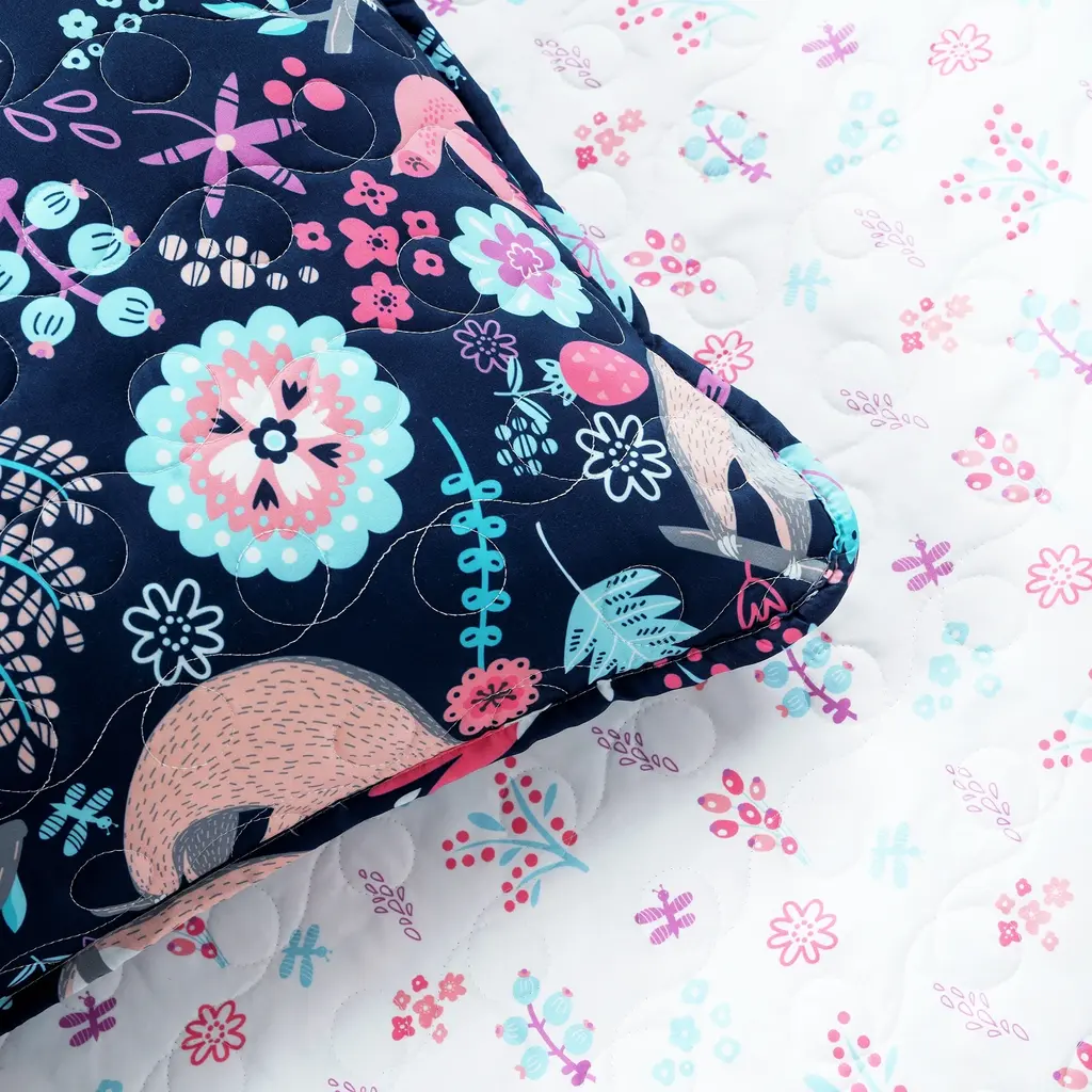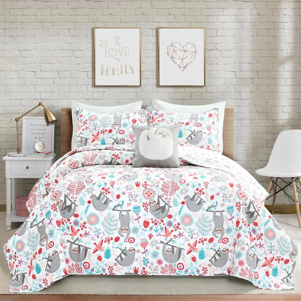 Update your childs bedroom with this adorable reversible quilt set featuring sloths, birds, flowers and more printed on the front, and a more subdued pattern of little flowers on the back. This set will truly bring your child's imagination to life!Features:Fabric Content 100% PolyesterFill Content 50% Cotton, 50% PolyesterReversibleMachine Wash Cold, With Similar Colors, Gentle Cycle. Use Only Non-Chlorine Bleach When Needed.Tumble Dry Low, Light Iron If Needed.3-Piece Twin Set Includes: 1 Quilt: 86 inches long x 68 inches wide 1 Sham: 20 inches long x 26 inches wide 1 Decorative Pillow: 16 inches x 16 inches4-Piece Full/Queen Set Includes: 1 Quilt: 92 inches long x 88 inches wide 2 Shams: 20 inches long x 26 inches wide 1 Decorative Pillow: 16 inches x 16 inches