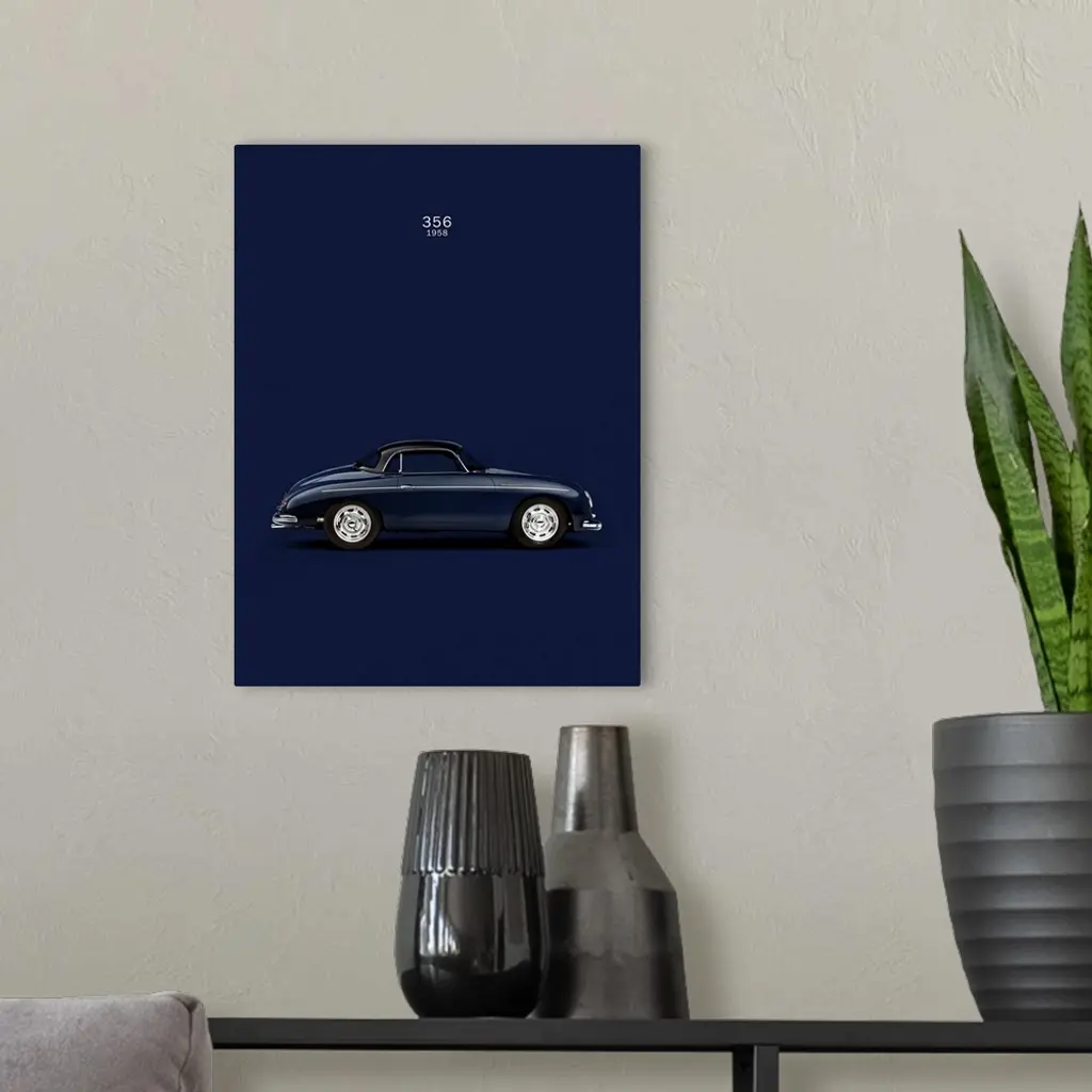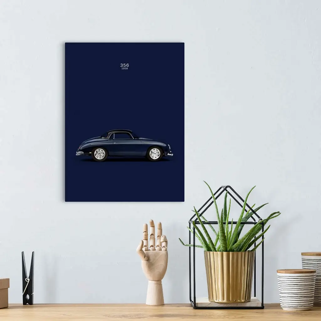 Photograph of a navy blue Porsche 356 1958 Blue printed on a navy blue background
