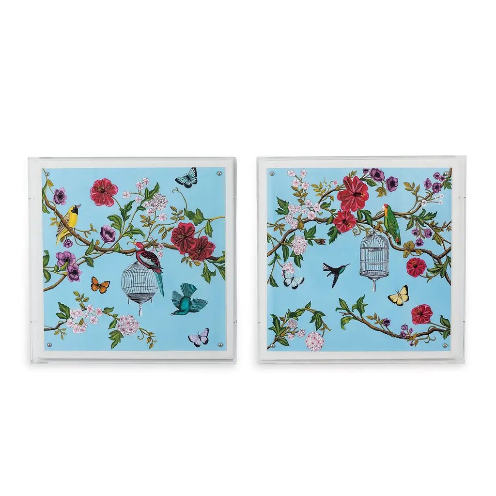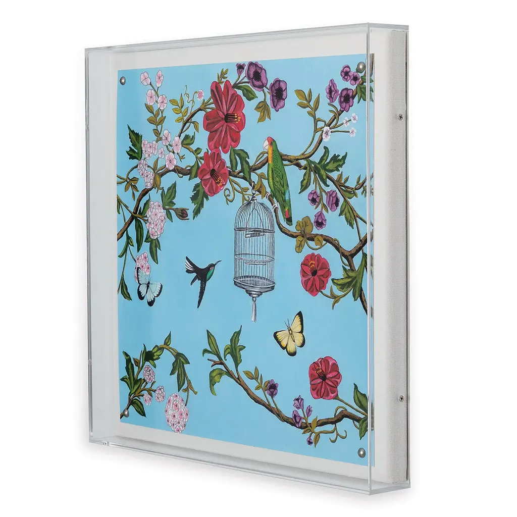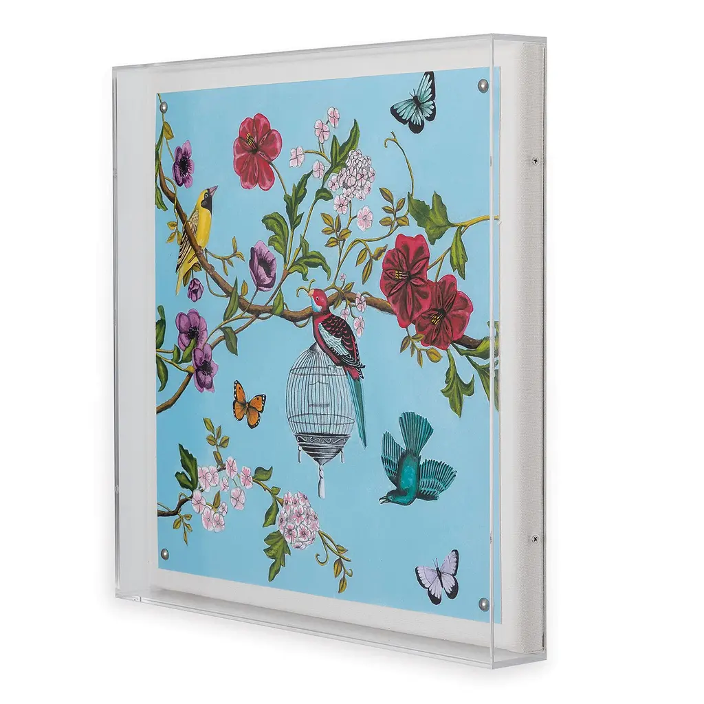 Bird Song I and Bird Song II are individually sold. Measurements: 20" x 20" x 2.5"D Materials: acrylic shadowbox frame, mdf, silk This item is custom framed. Production time is 3-4 weeks. Free shipping in the U.S.
