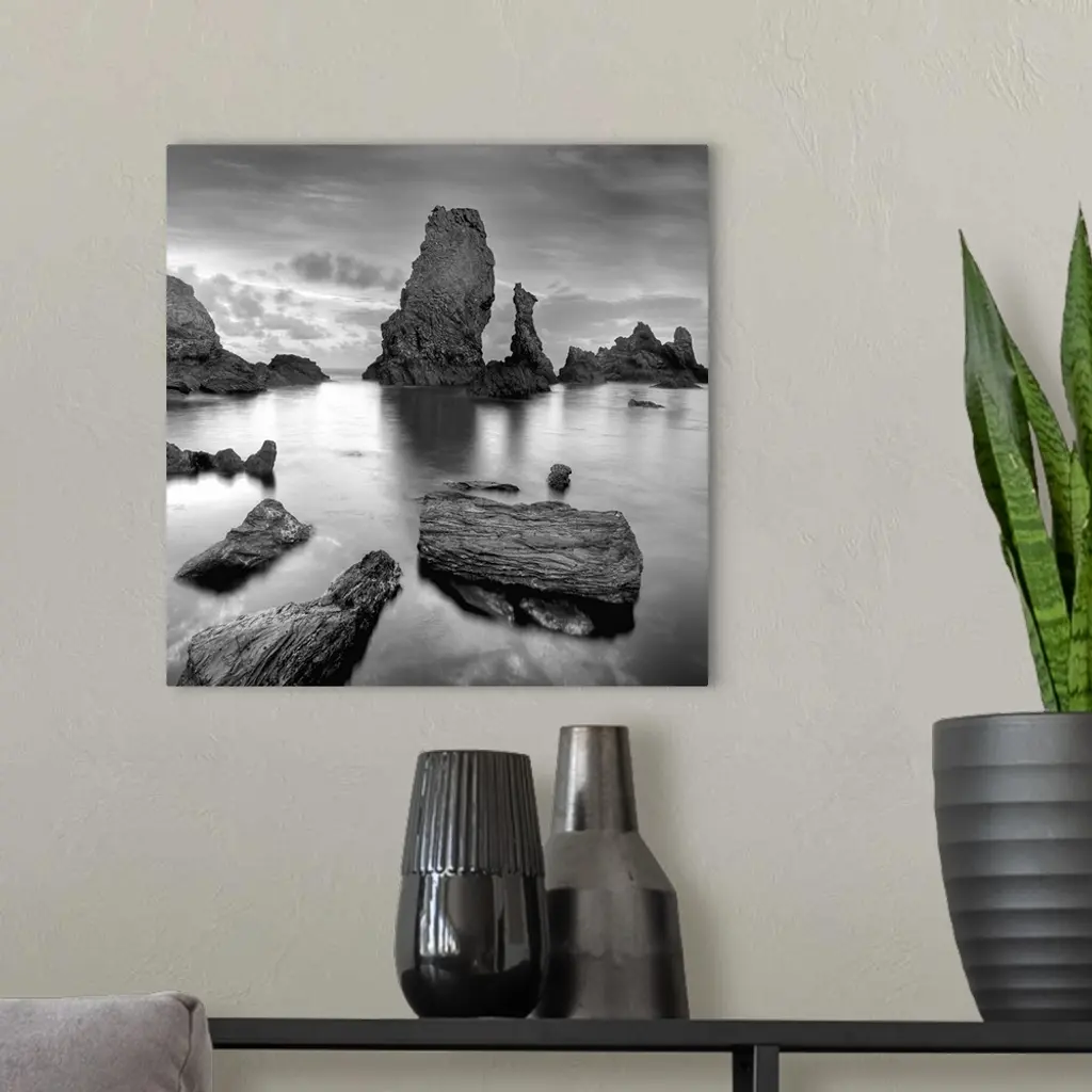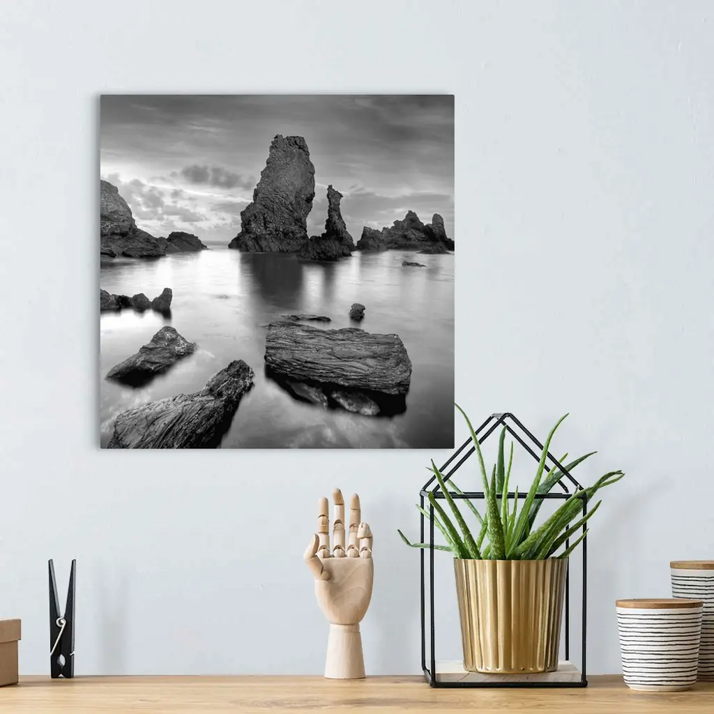 Big natural rocks in Belle Ile en Mer beach called Port coton in France, Brittany, black and white picture.