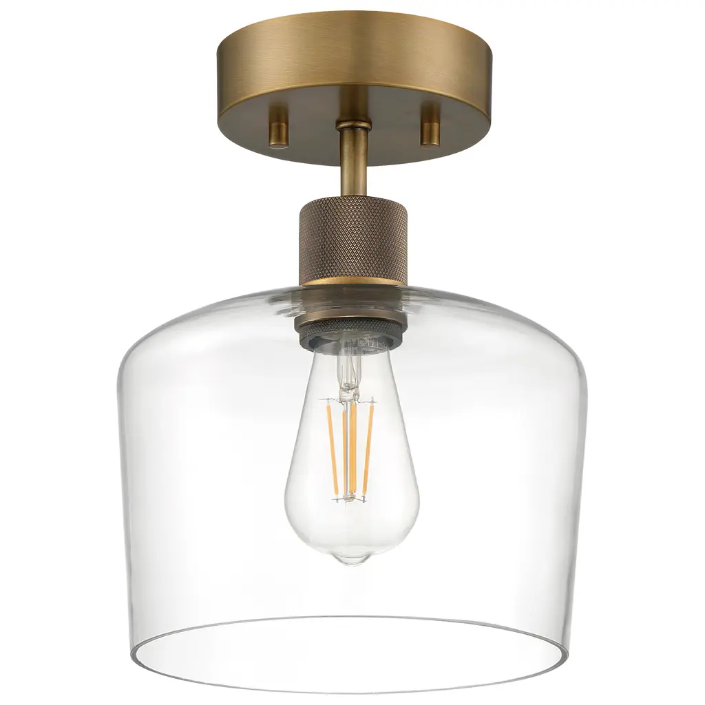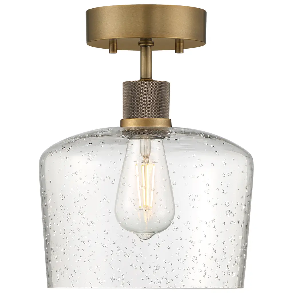 Is your favorite chardonnay calling your name, or is it just this chardonnay glass light fixture? Smooth and curved angles add character to any room, the clear globe providing downward light that seems to pour out of its chardonnay glass. Install this modern LED light fixture in hallways, at the top of staircase landings, or in your living room.Ceiling, Contemporary, Delivered Lumens 500-600, Energy Efficient, Indoor, JA8/Title 24, Modern, Semi-Flush, TransitionalETL (US/Canada) Listed, Energy Efficient, JA8-2016/Title 24, Title 20Color/Finish Options: Antique Brushed Brass, Brushed Steel, or Matte BlackGlass Options: Clear or SeededMaterial: SteelDimensions: 9 inch diameter x 11.75 inch heightWeight: 6 poundsSlope Ceiling Capable: NoBulb Shape: A-19 (RLED)Socket Type: E-26Bulb Included: Yes