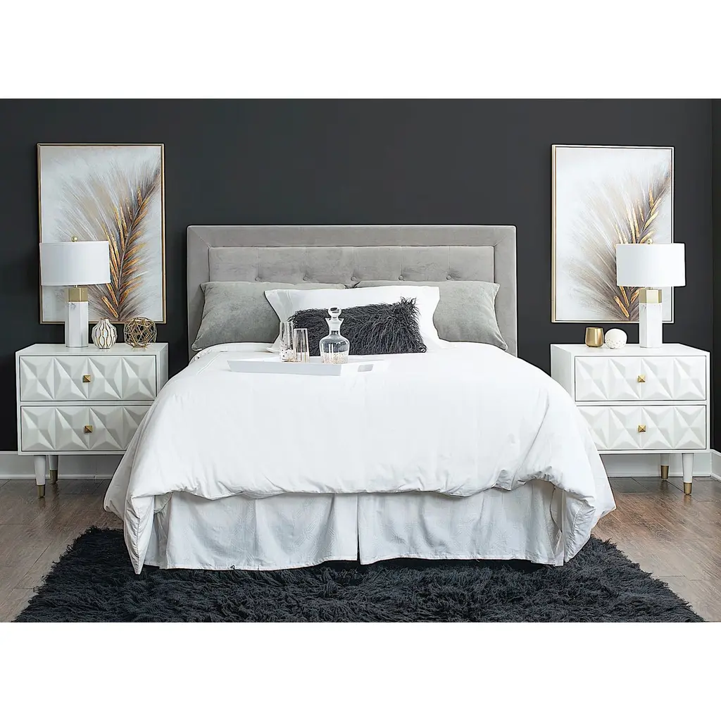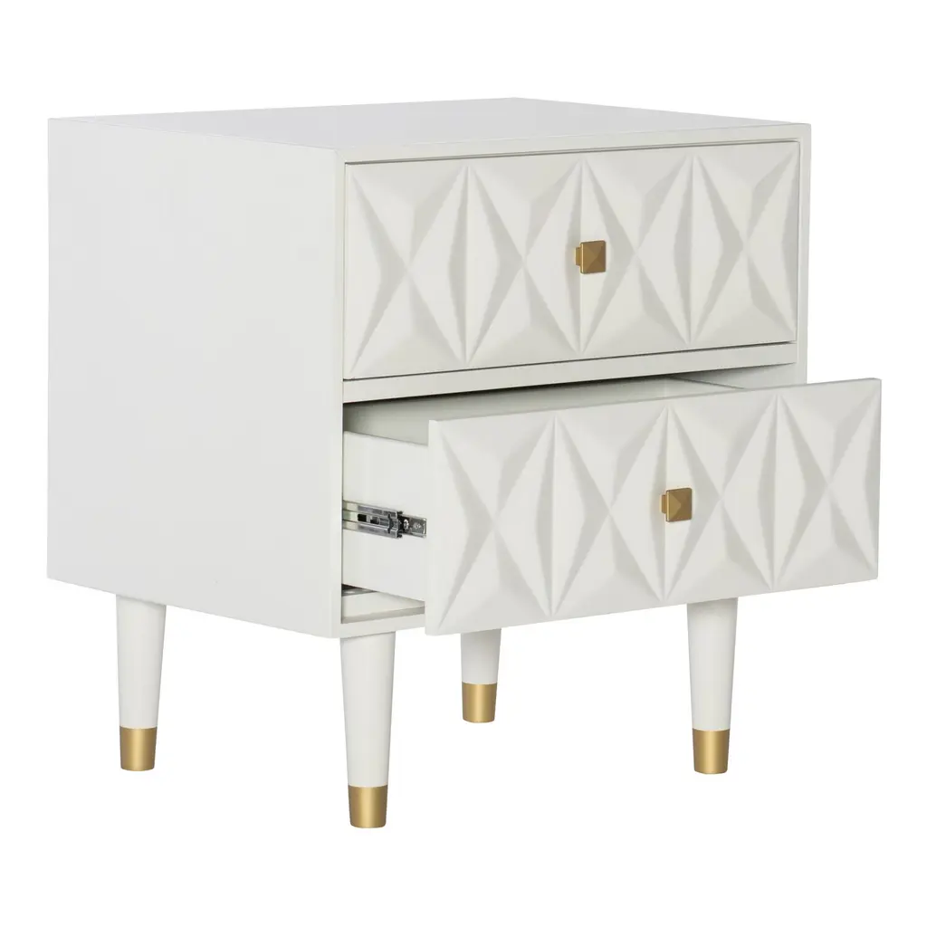 A chic statement piece, our Porter nightstand exudes design-savvy vibes with its crisp finish in your choice of colors, gleaming gold hardware, tapered gold-capped legs and clean silhouette. The icing on the cake, of course, is its stunning, geometric dimensional front. With two roomy drawers, you'll have plenty of convenient storage for all your cozy-time necessities.