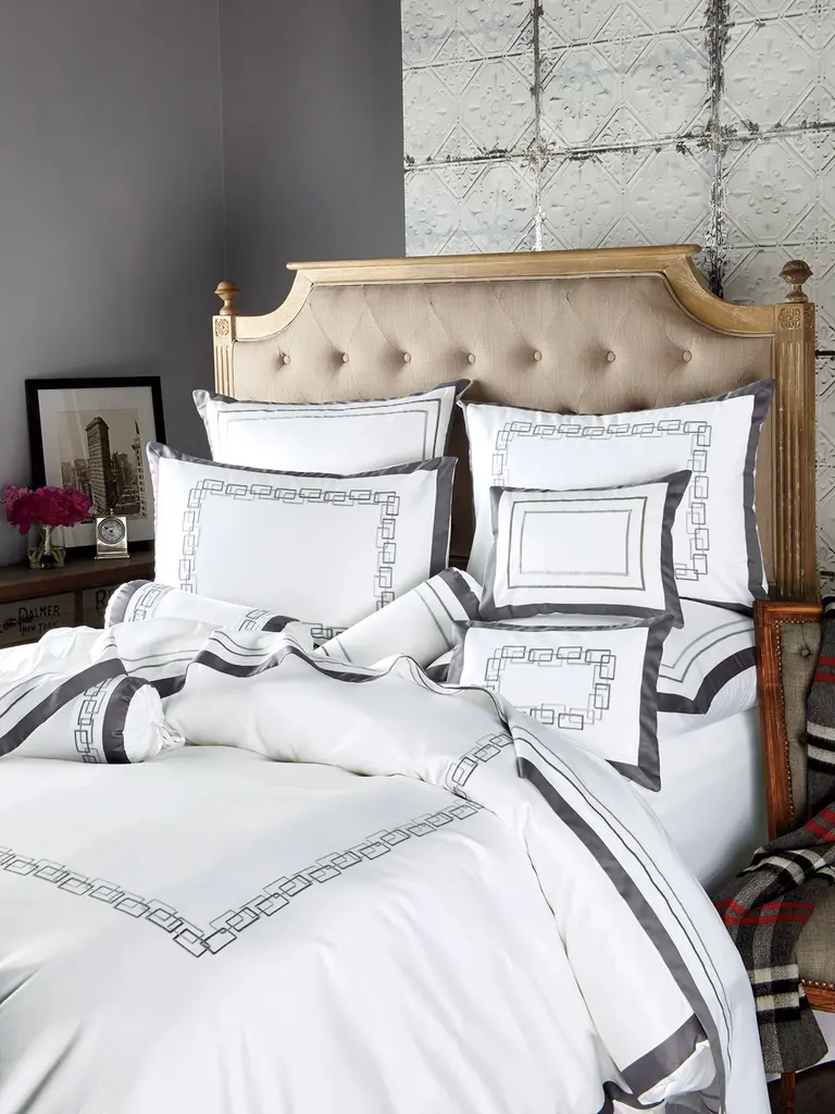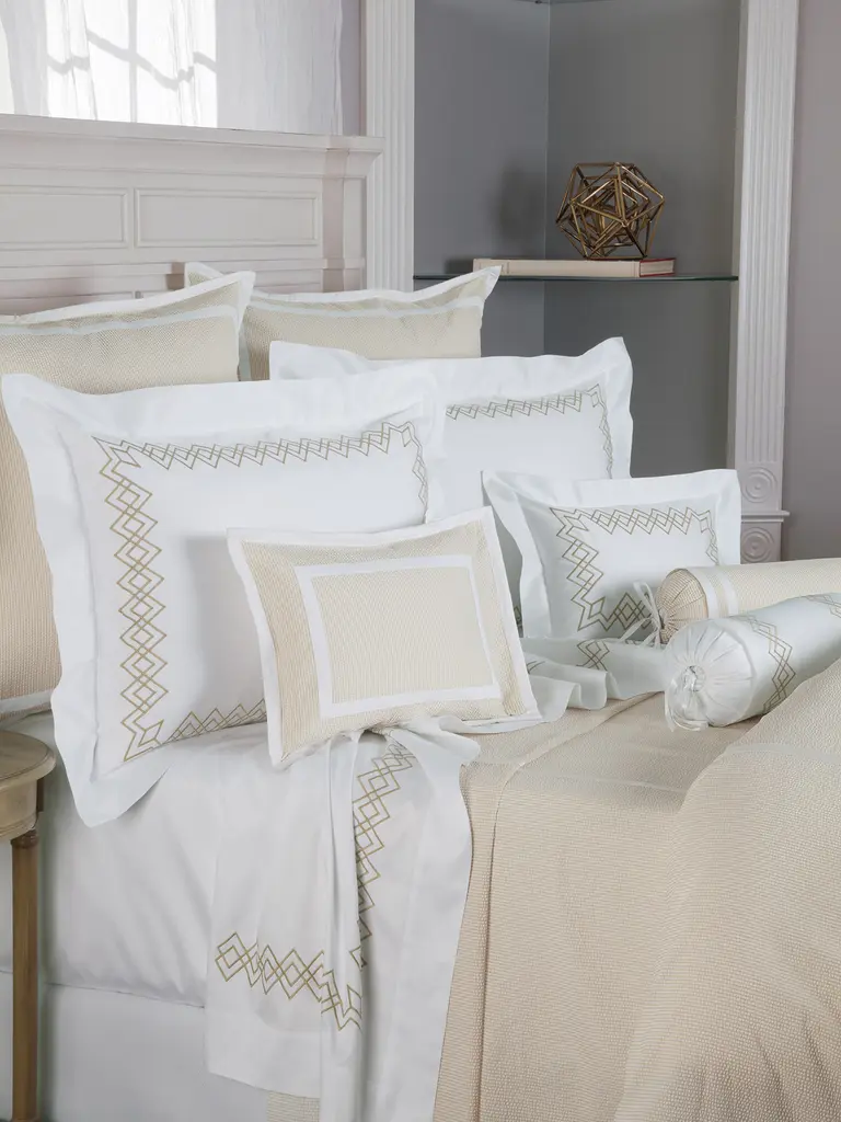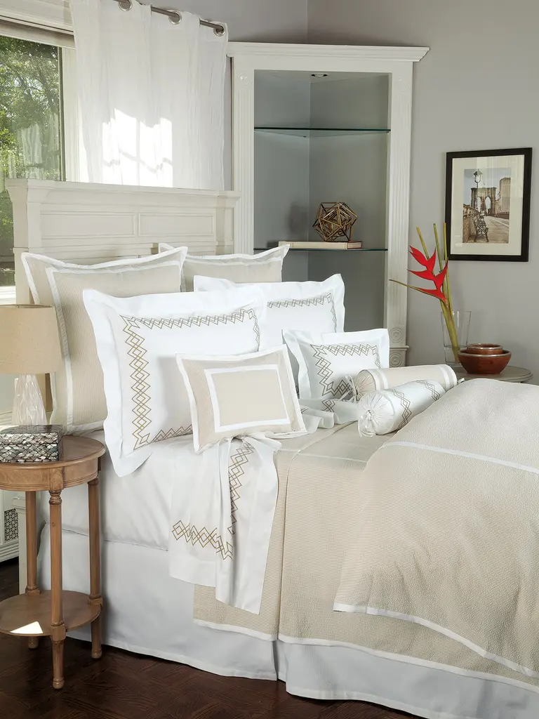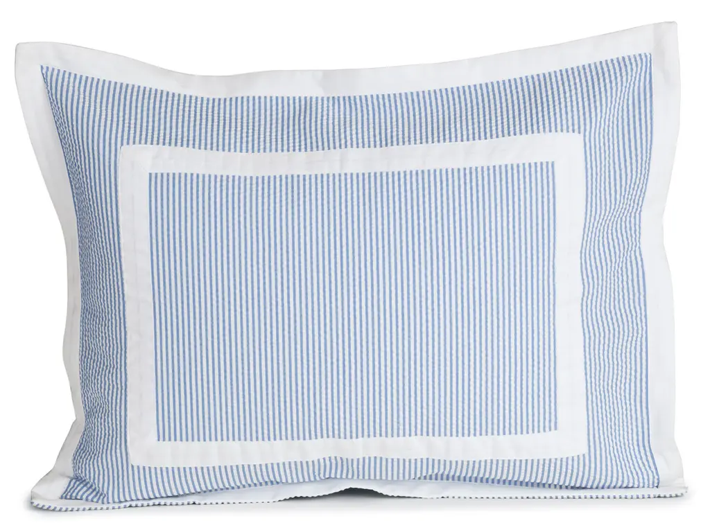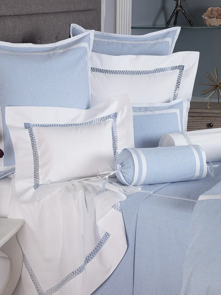 Bedding never seemed so supple and sturdy as with this fine, seersucker fabric. Easy care and shrink resistant, Portland is made from cotton/poly blend. These blanket covers, duvet covers and shams come in white & blue stripes or white & beige stripes, each featuring a white narrow trim at border. Imported from Italy.