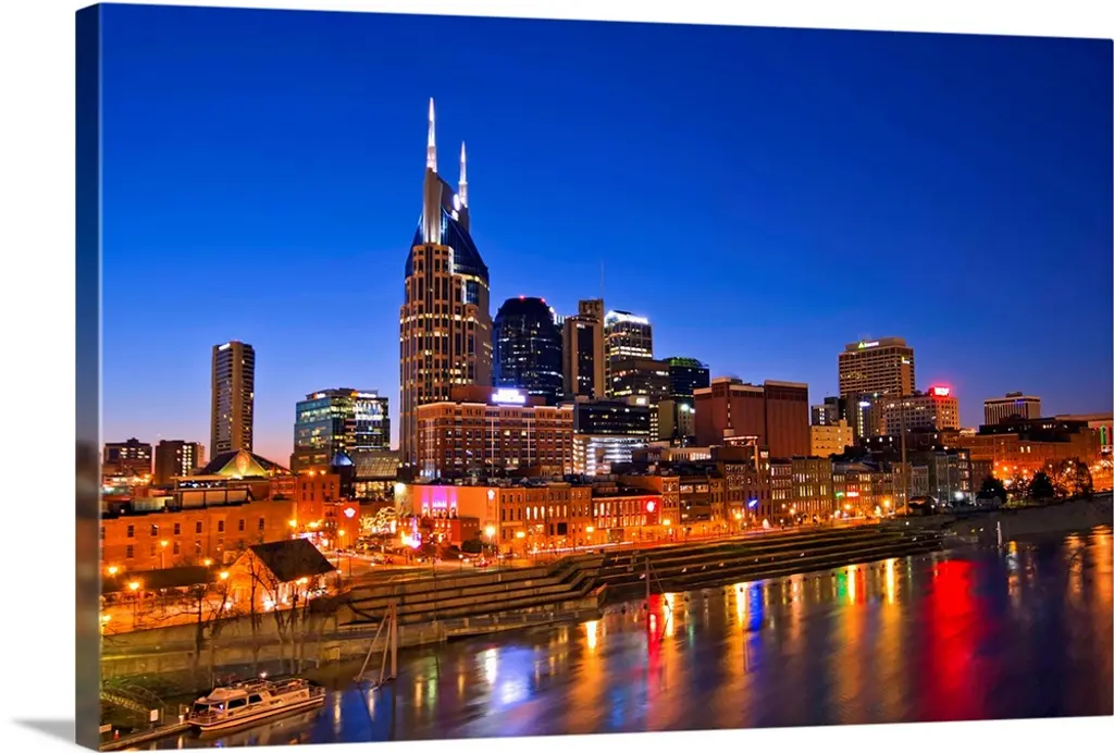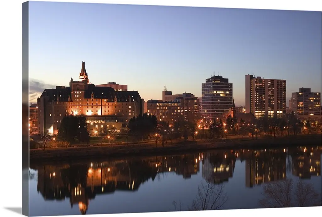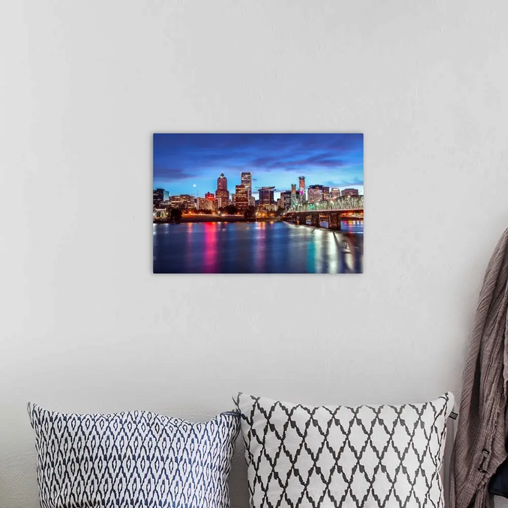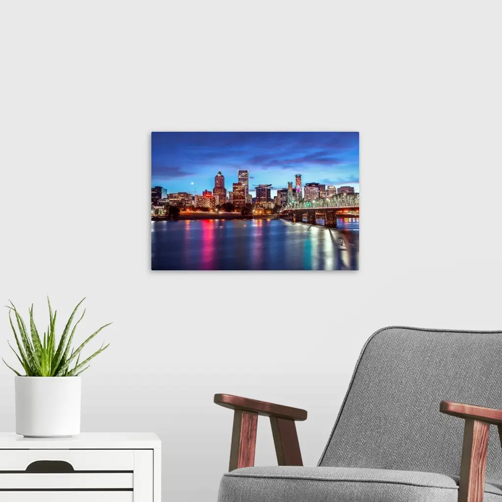 Photograph of the Portland, Oregon skyline lit up at sunset with colors reflecting onto the Willamette River in the foreground and a crescent moon above.