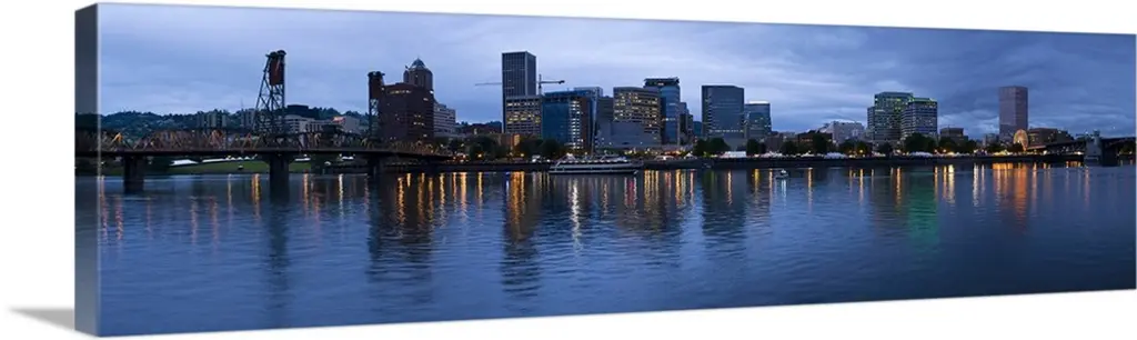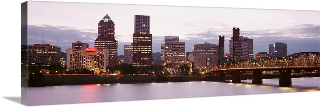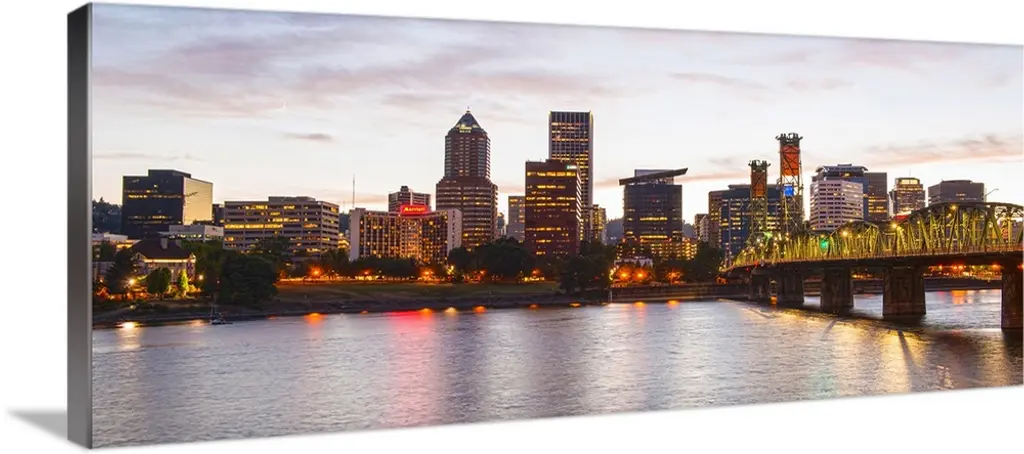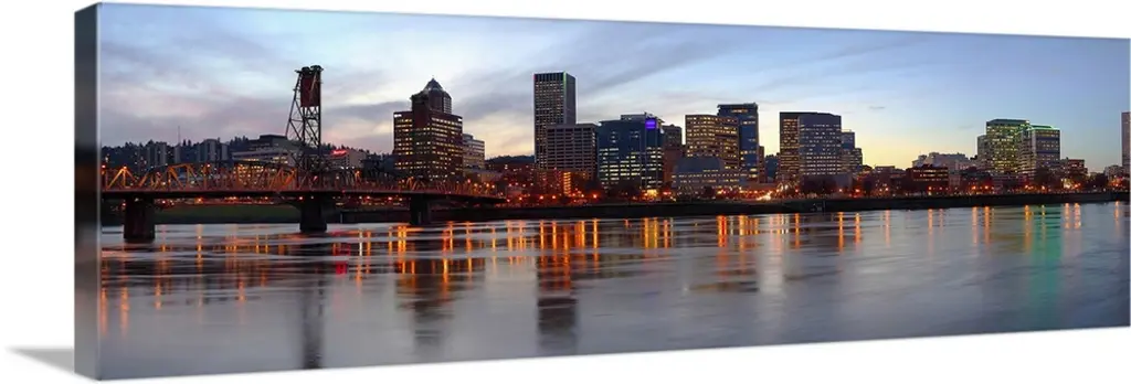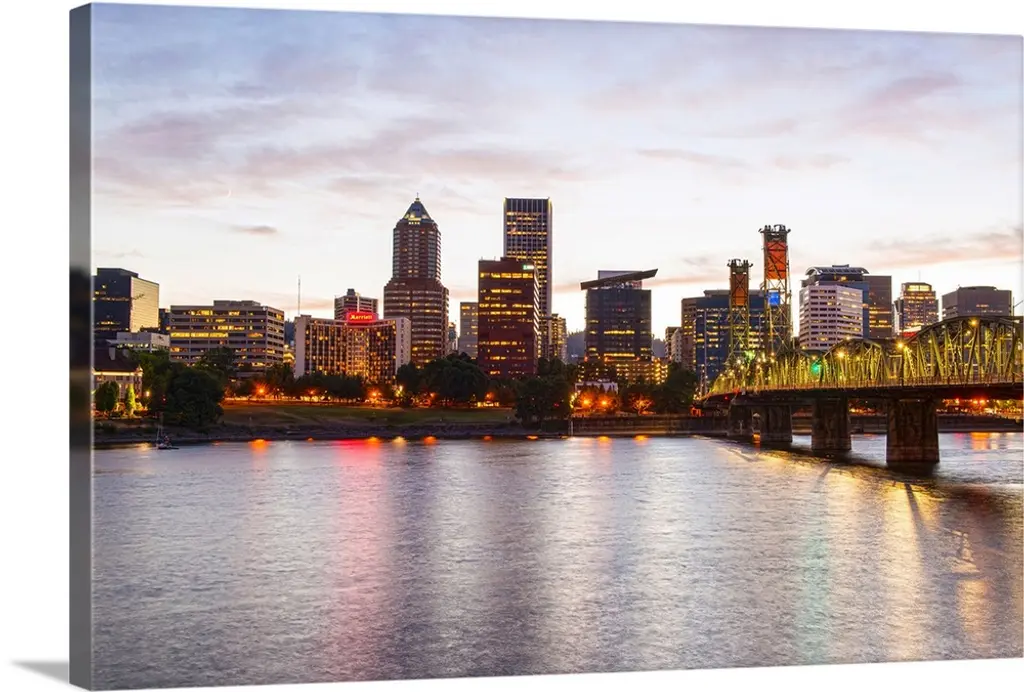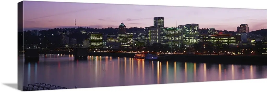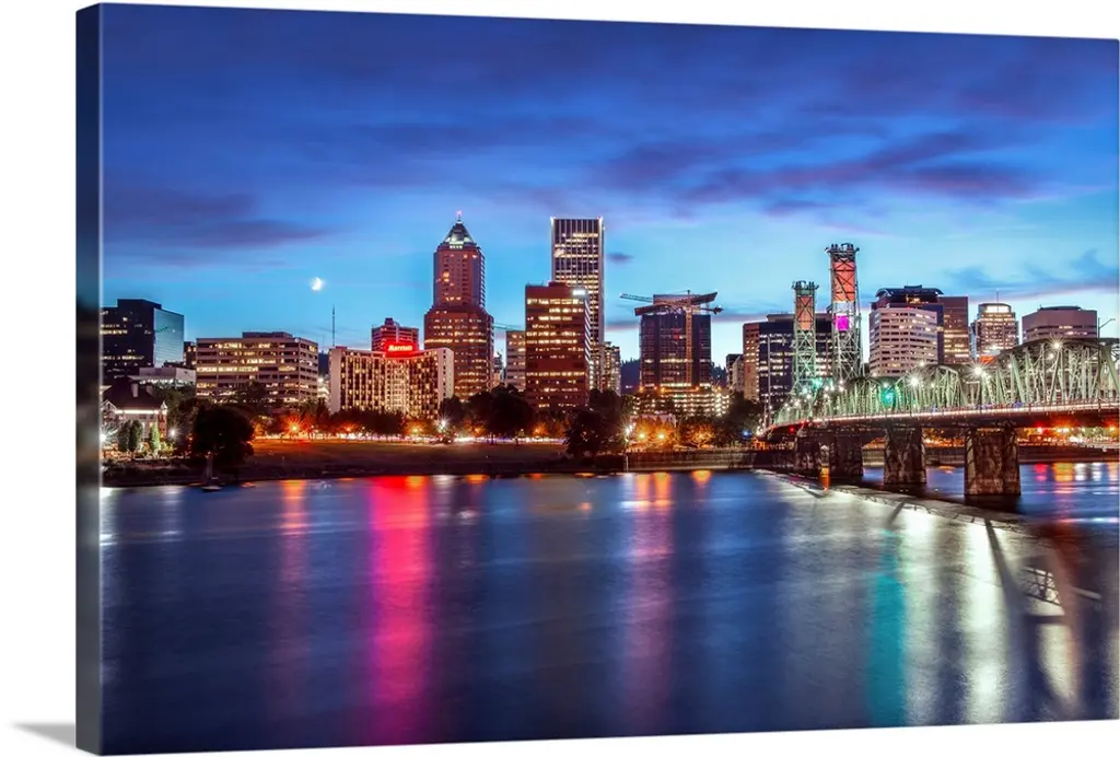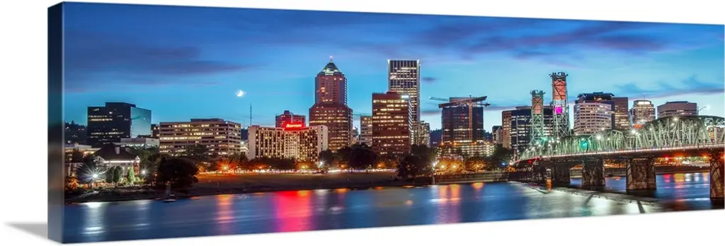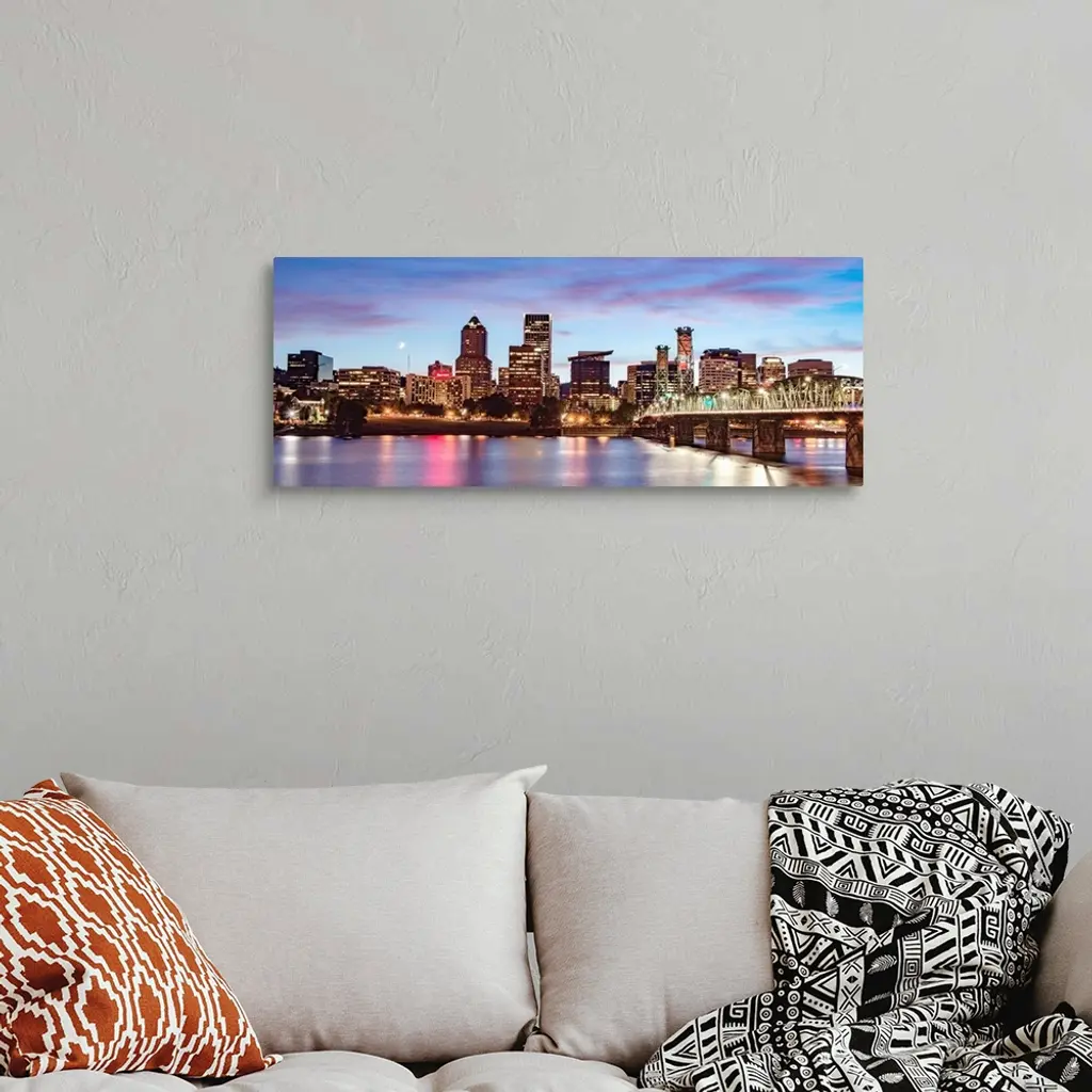 Panoramic photograph of the Portland, Oregon skyline with a purple and pink sunset and a crescent moon above.