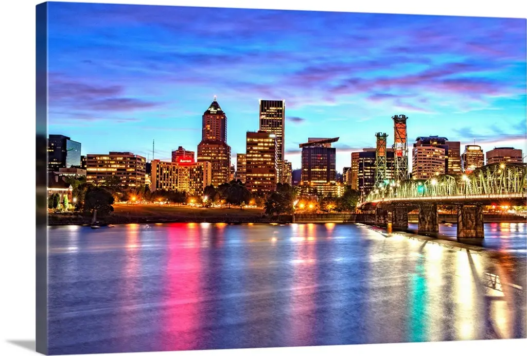 Portland, Or Skyline - Purple And Pink Sunset And Crescent Moon