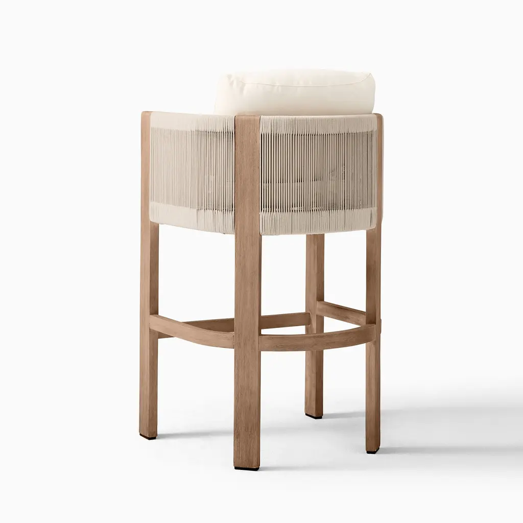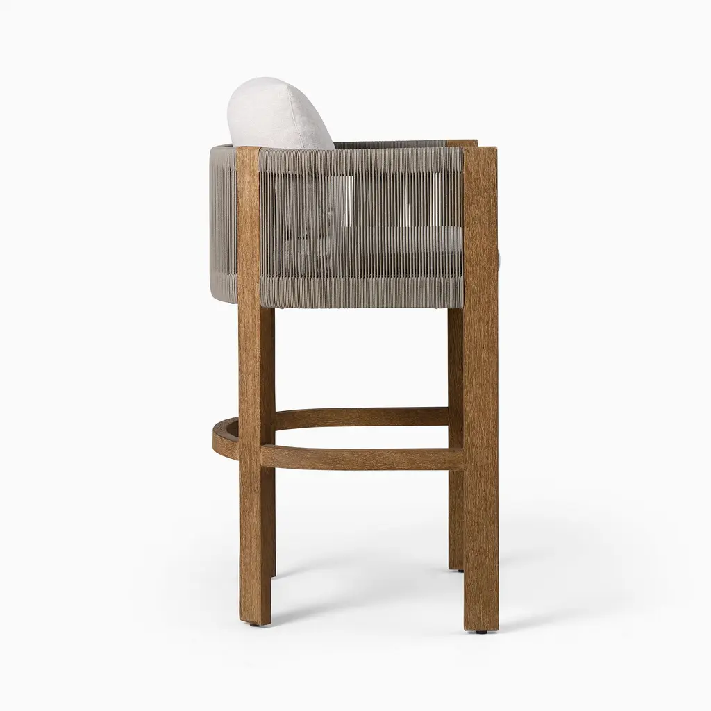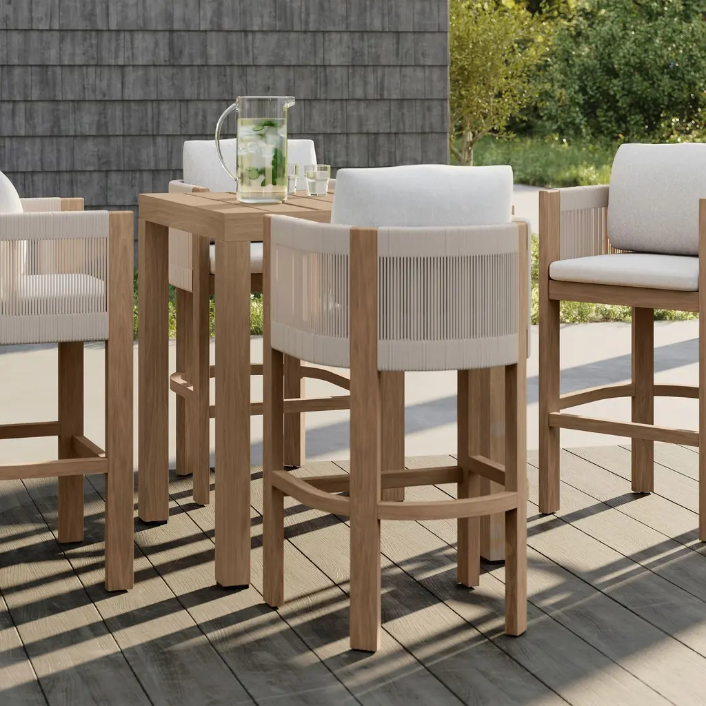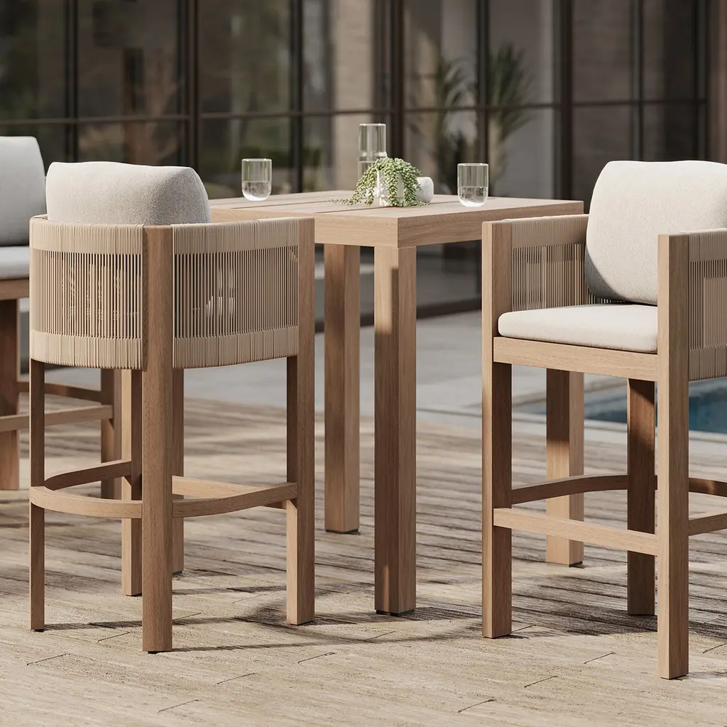 Modern cording pairs beautifully with mahogany wood. Weather-resistant cushions offer cozy comfort. Brings a contemporary look to your outdoor bar. Contract Grade, so you know it's built to last.