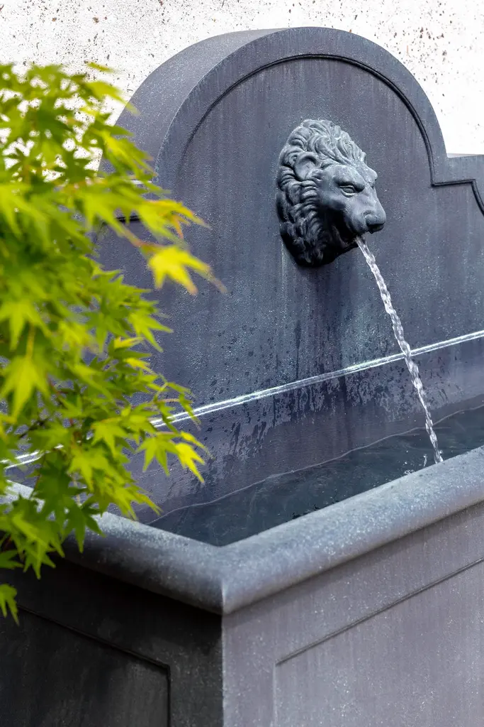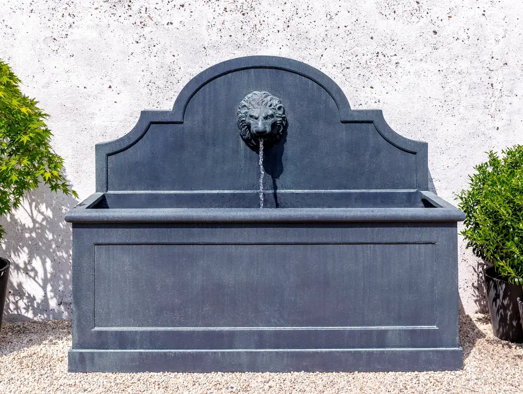 A wall fountain of Glass Fiber Reinforced Concrete (GFRC) with a lion's head in a lead antique finish.