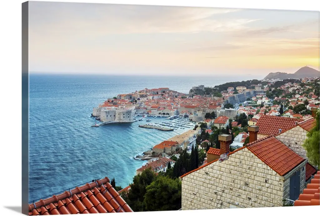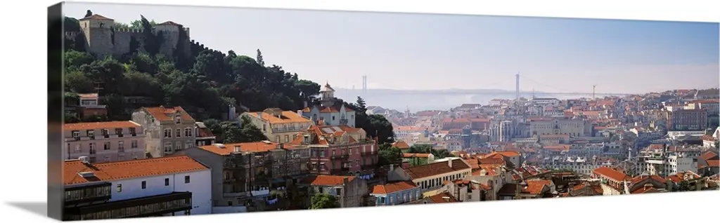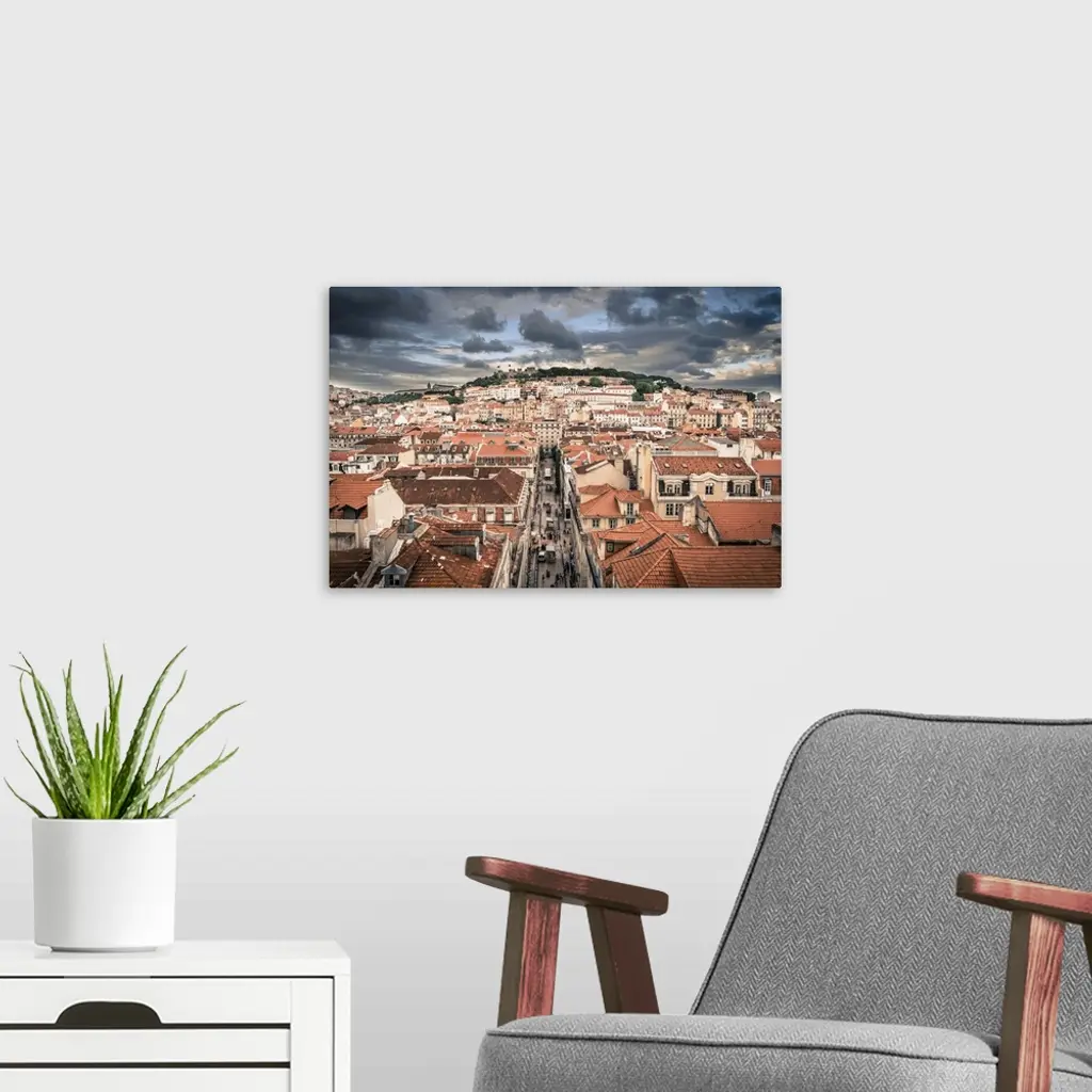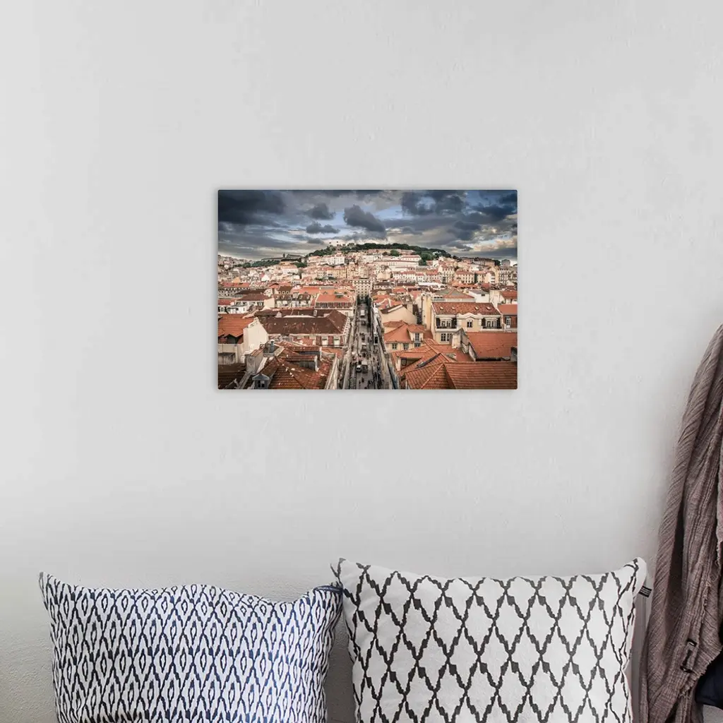 Portugal, Lisbon, rooftop view of Baixa District with Sao Jorge Castle and Alfama District beyond