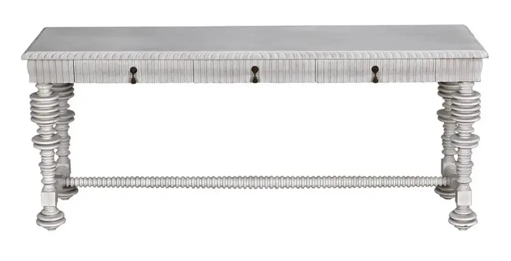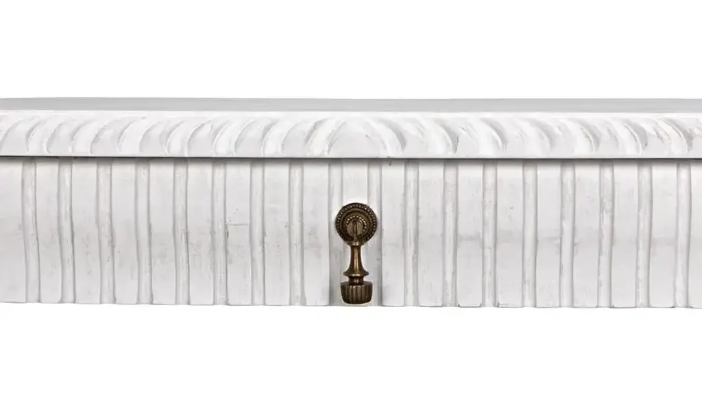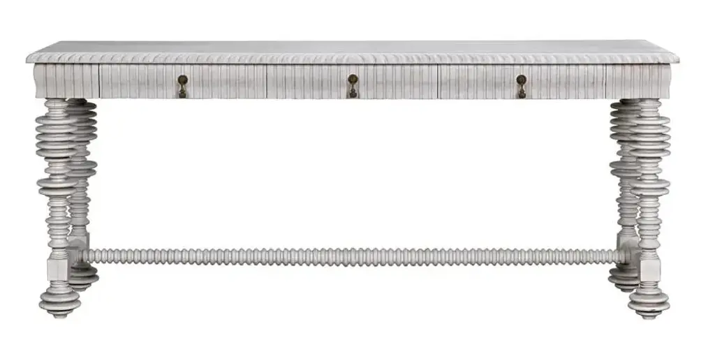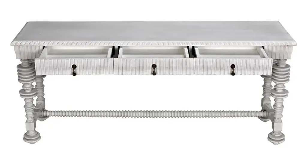 Introducing the stunning Portuguese Console in White Wash, a masterpiece crafted to perfection by Noir Trading, Inc. This console effortlessly combines classic design with a touch of rustic charm, making it a standout addition to any living space. The Portuguese Console is meticulously designed with premium Mahogany wood and a White Wash finish, adding a sense of elegance and sophistication to your interior decor. The console's dimensions are thoughtfully crafted with ample space, measuring 72.5 inches in width, 20.5 inches in depth, and 31 inches in height.