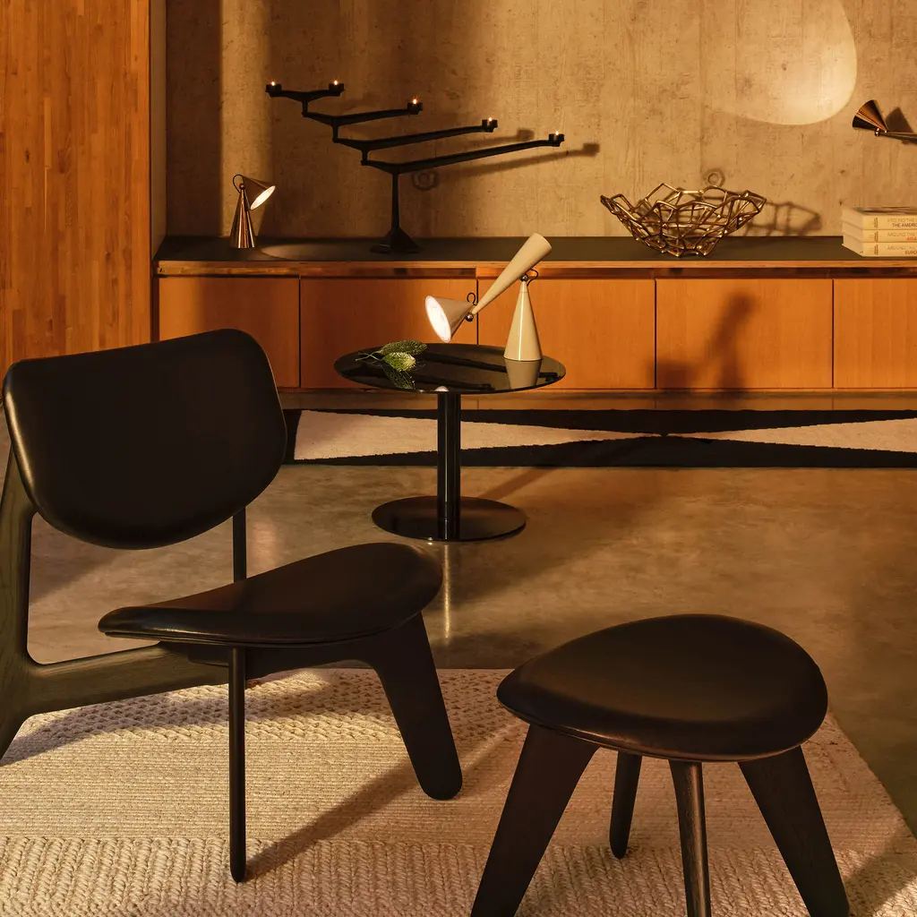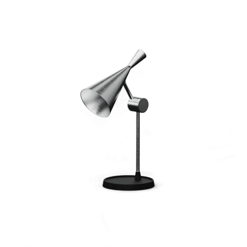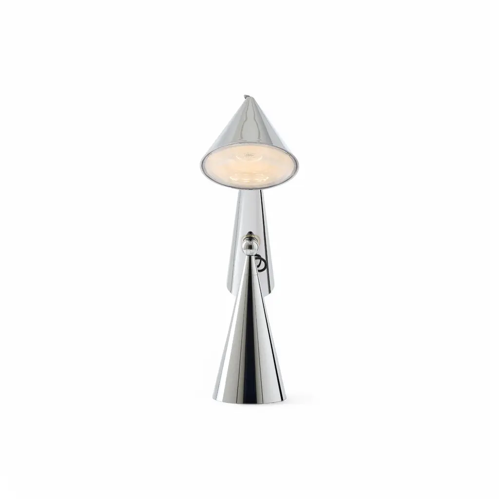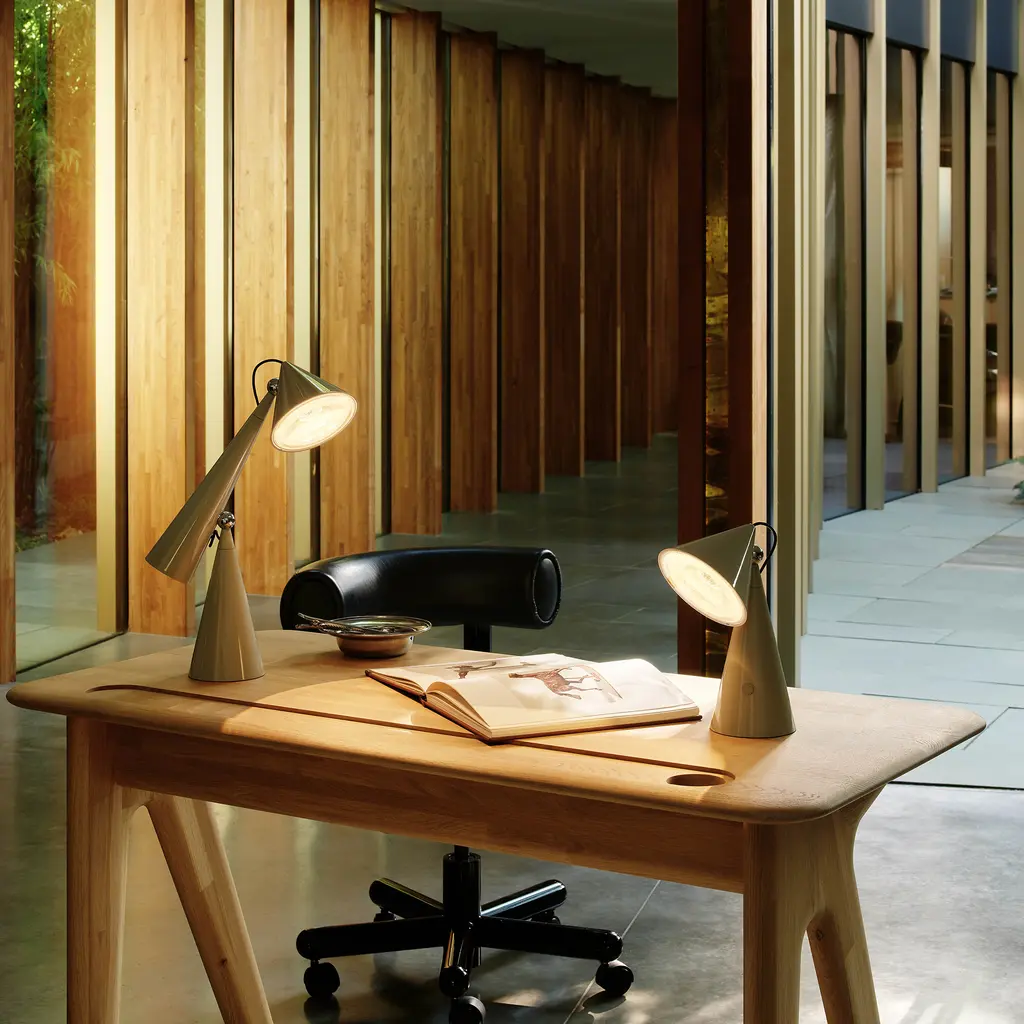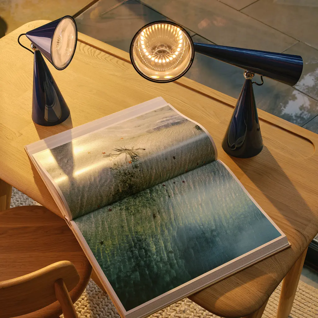 The Pose Task Light by Tom Dixon is a sculptural desk lamp that combines striking geometric shapes with focused illumination. Its conical metal shades, mounted on a pivoting joint, allow for easy adjustability, directing light precisely where needed. Inspired by optical physics and the function of lighthouse lenses, this high-output LED lamp casts a concentrated, magnified beam. Crafted from durable metal with a sleek, polished finish, Pose stands as both a functional light source and a bold visual statement. Its stacked conical base provides stability, while its articulated arm offers flexibility for reading, working, or highlighting specific areas. Available in multiple finishes, including the deep green Kelp, it adapts to modern interiors with ease. Ideal for home offices, creative studios, or refined living spaces, Pose is as much a design object as it is a task light.