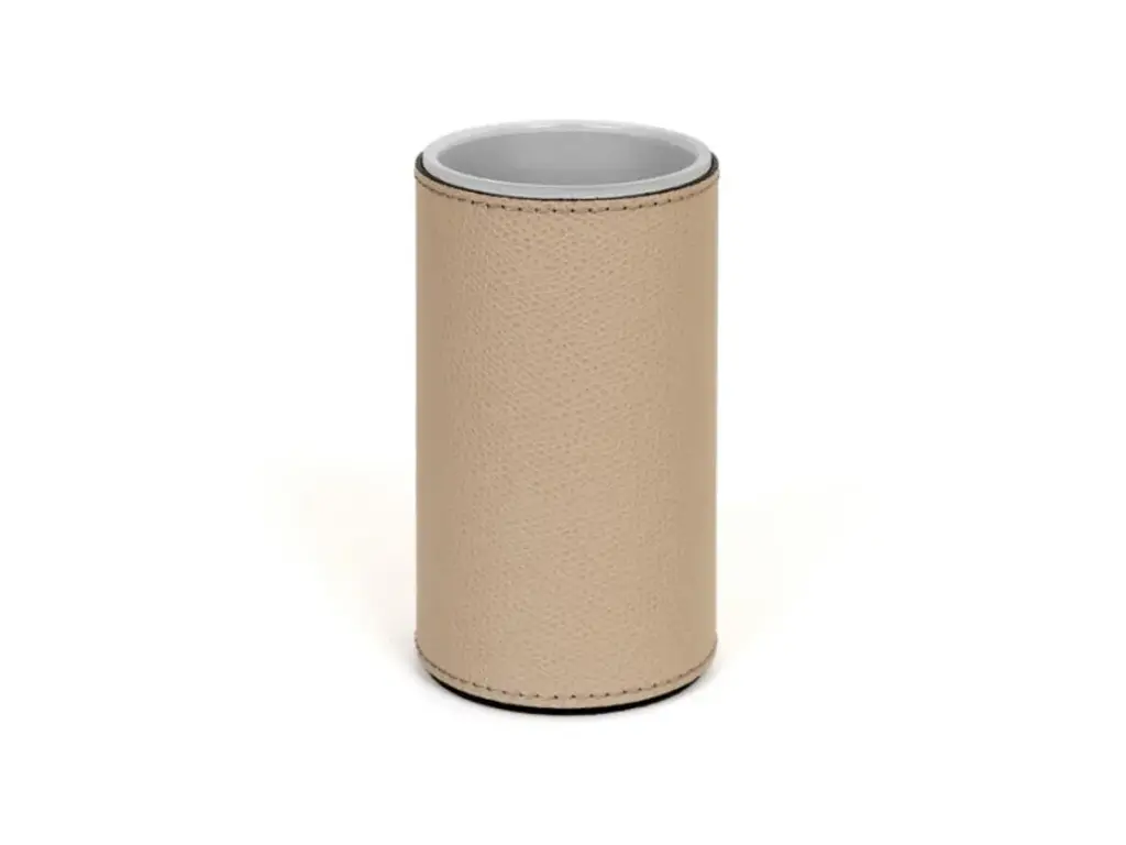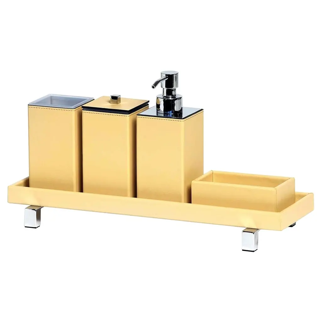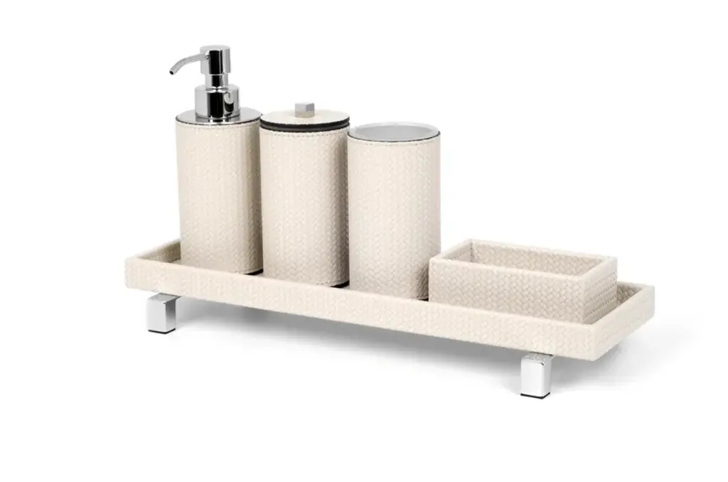 Poseidon is a bathroom set entirely covered in soft and waterproof genuine leather. Our Rialto tray, together with a round soap dispenser, a toothbrush holder, a cotton pad holder and a small box for rings to create a complete set. Five accessories with simple and minimal design perfect for contemporary and traditional bathroom suites. Available in round and square shape, and with shiny gold details as well.
