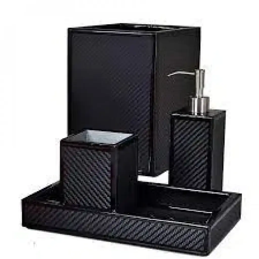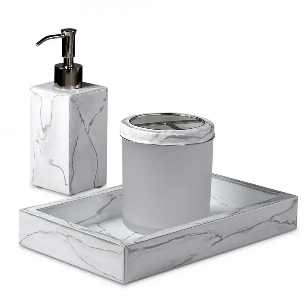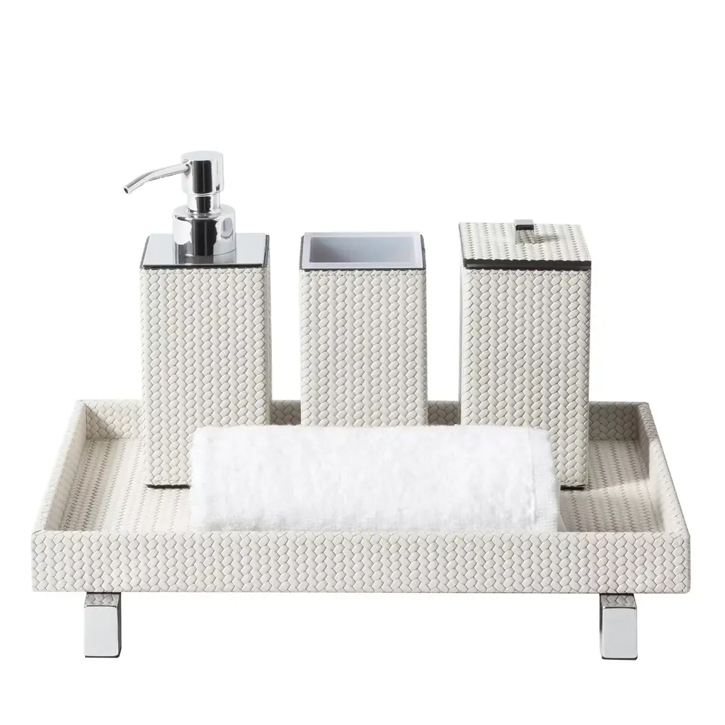 Poseidon is a square bathroom set entirely covered in soft and waterproof genuine leather. The Rialto tray, together with a square soap dispenser, a toothbrush holder, and a cotton pad holder with simple and minimal design perfect for contemporary and traditional bathroom suites.