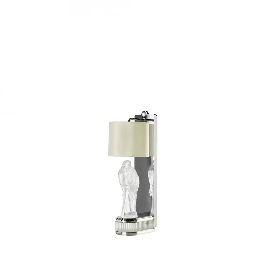 Lalique follows a natural path between the countryside and the sea. A vertical bias endows this lamp with exquisite originality. A veil of brilliant crystal that takes us to the bottom of the seas, decorates the chrome-plated aluminum frame of this innovative and modern lamp. Trained as a jeweler at the Ecole des Arts Decoratifs in Paris in the late 1880's, Rene Lalique gained recognition as an independent designer for some of the era's great jewelry houses including Cartier and Boucheron. Eventually, he turned to glassmaking, and his techniques were a triumph for the Art Deco movement. Every piece of Lalique is finely detailed and produced by hand in Alsace, France.