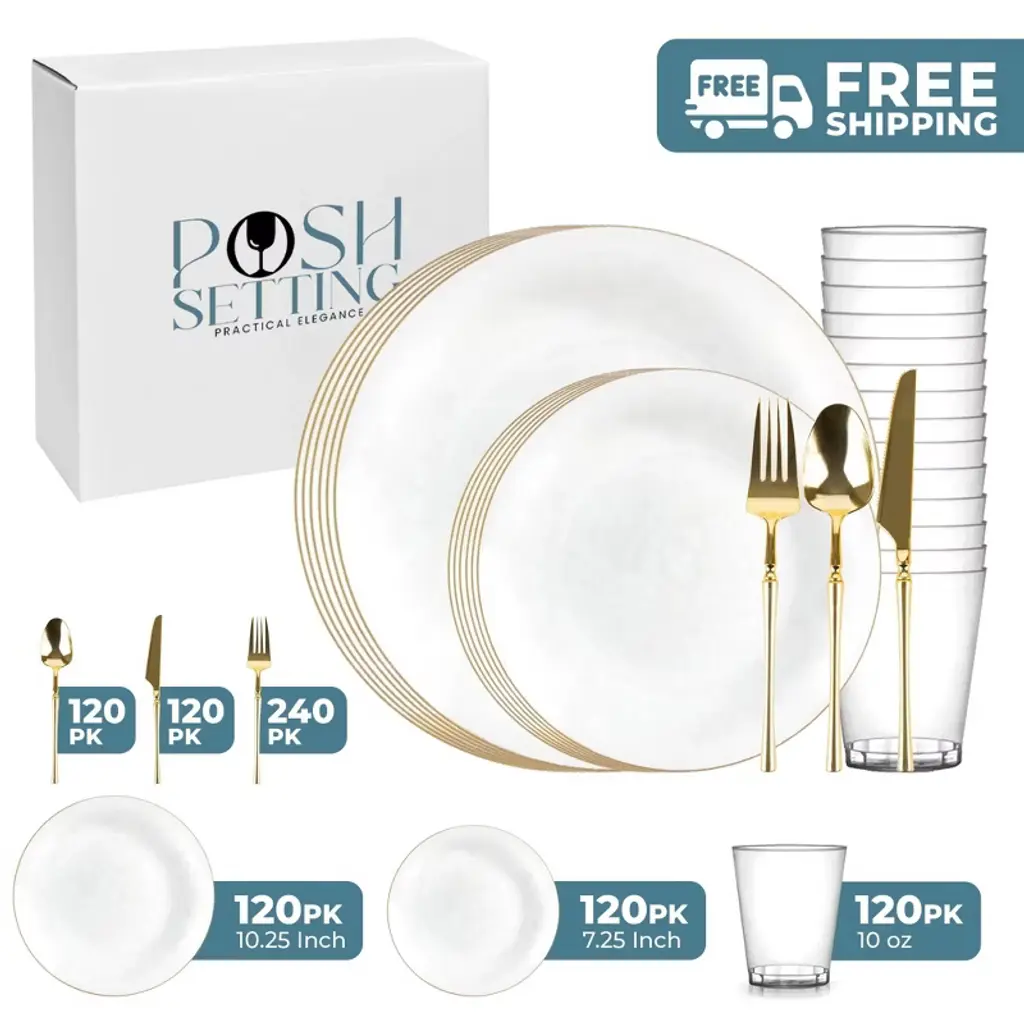 Posh Setting Elegant Clear and Gold Disposable Dinnerware Bundle offers the ultimate convenience for hosting upscale events. This all-inclusive set features dinner plates, salad/appetizer plates, 10oz clear hard plastic cups, spoons, knives, and double forks per setting, all in a refined Clear and Gold design. Ideal for weddings, parties, and upscale gatherings, ensuring easy cleanup.