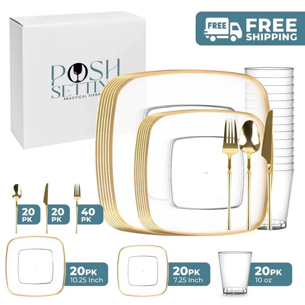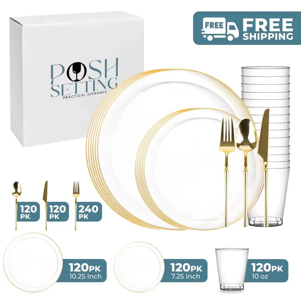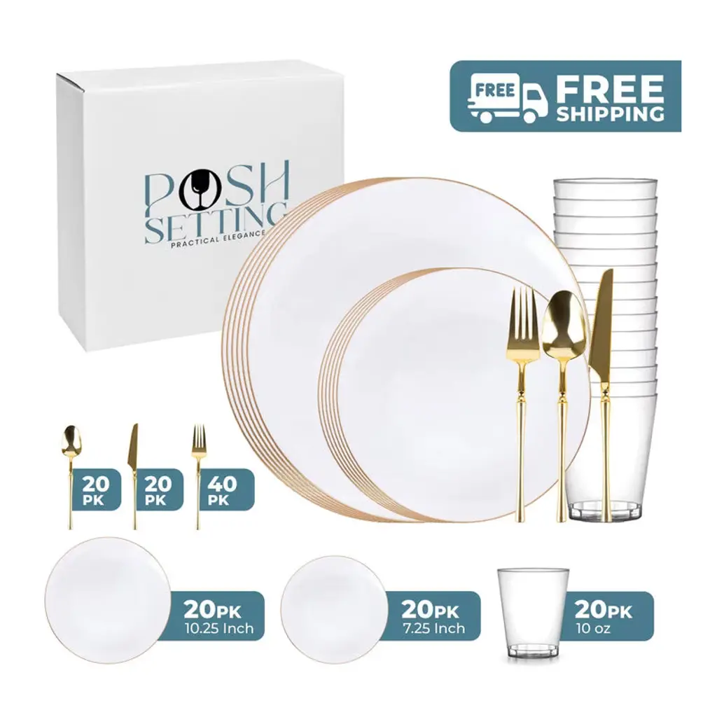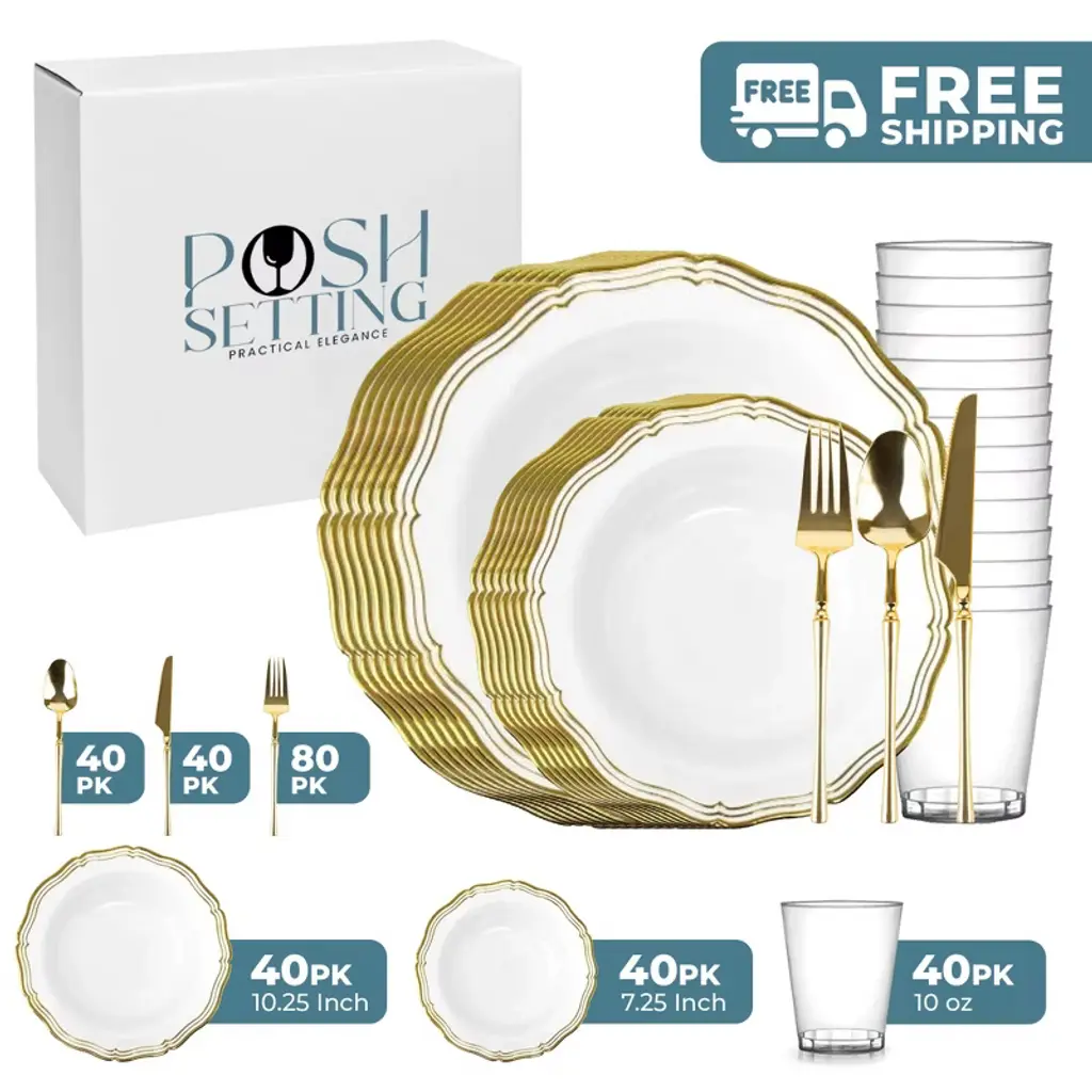 Posh Setting Elegant White and Gold Disposable Dinnerware Bundle offers the ultimate convenience for hosting upscale events. This all-inclusive set features dinner plates, salad/appetizer plates, 10oz clear hard plastic cups, spoons, knives, and double forks per setting, all in a refined White and Gold design. Ideal for weddings, parties, and upscale gatherings, ensuring easy cleanup.