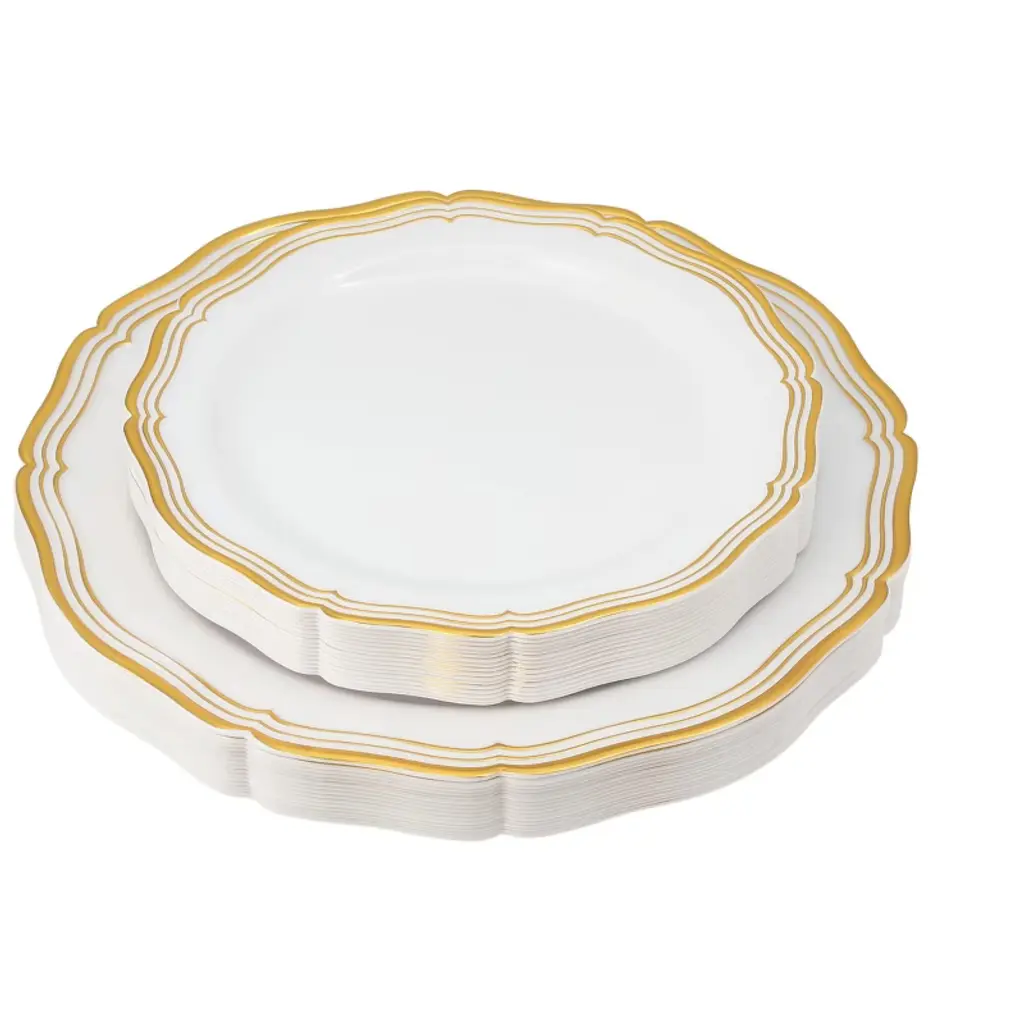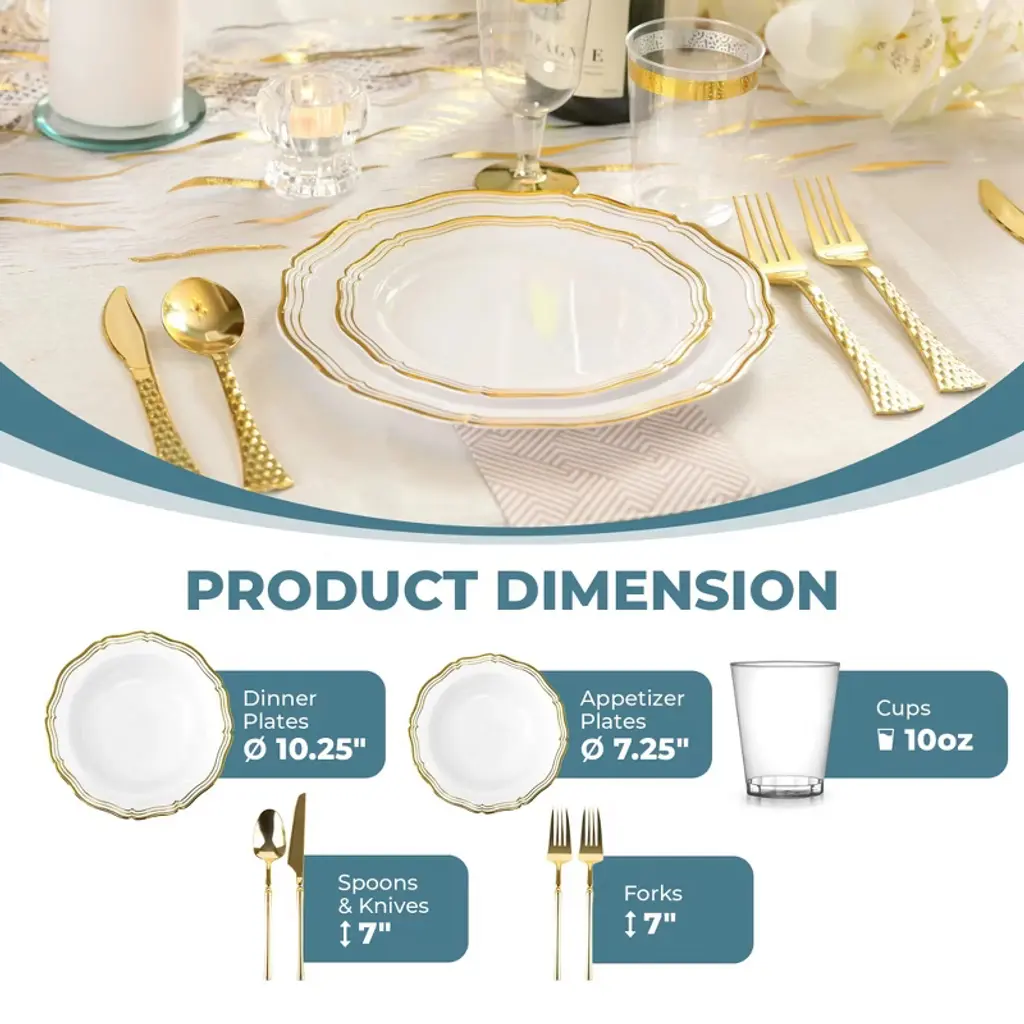Posh Setting Elegant White and Gold Disposable Dinnerware Bundle offers the ultimate convenience for hosting upscale events. This all-inclusive set features dinner plates, salad/appetizer plates, 10oz clear hard plastic cups, spoons, knives, and double forks per setting, all in a refined White and Gold design. Ideal for weddings, parties, and upscale gatherings, ensuring easy cleanup.