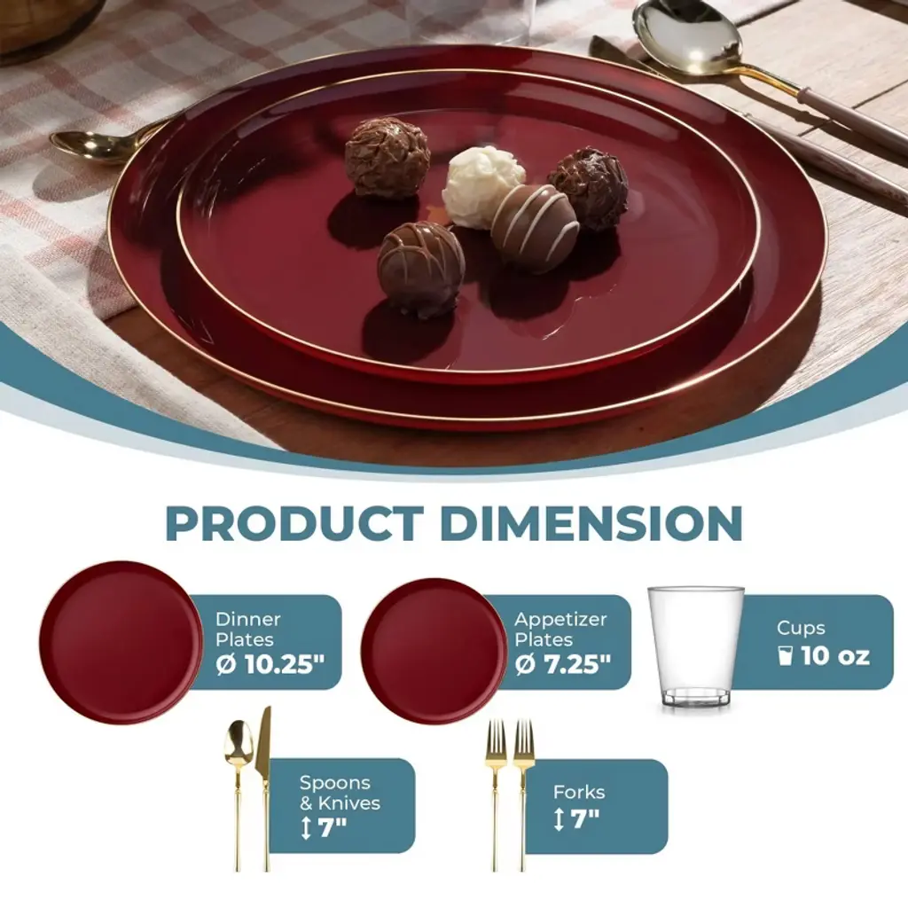 Posh Setting Elegant Cranberry and Gold Disposable Dinnerware Bundle offers the ultimate convenience for hosting upscale events. This all-inclusive set features dinner plates, salad/appetizer plates, 10oz clear hard plastic cups, spoons, knives, and double forks per setting, all in a refined Cranberry and Gold design. Ideal for weddings, parties, and upscale gatherings, ensuring easy cleanup.