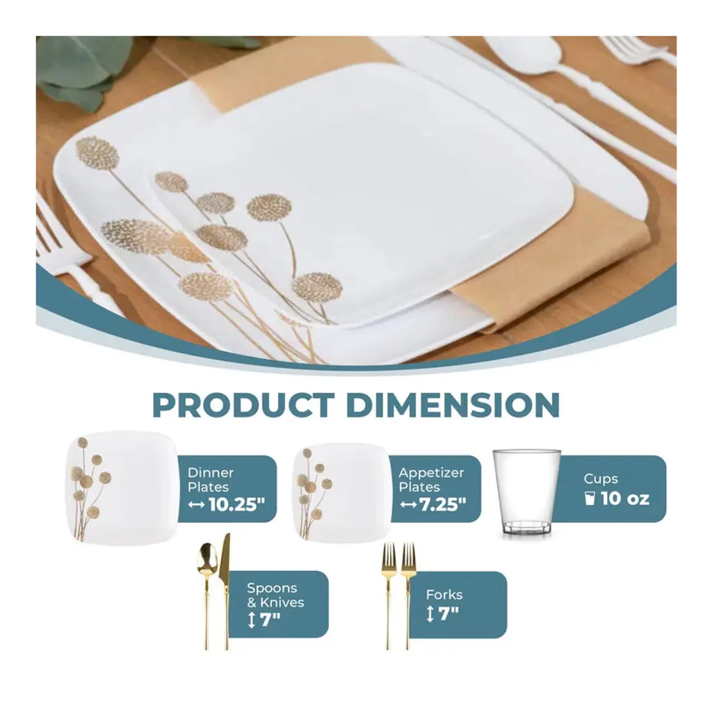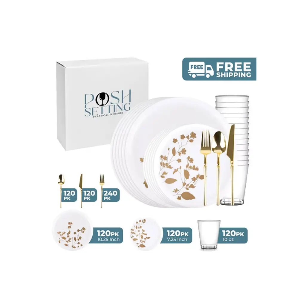 Posh Setting Elegant White and Gold Disposable Dinnerware Bundle offers the ultimate convenience for hosting upscale events. This all-inclusive set features dinner plates, salad/appetizer plates, 10oz clear hard plastic cups, spoons, knives, and double forks per setting, all in a refined White and Gold design. Ideal for weddings, parties, and upscale gatherings, ensuring easy cleanup.