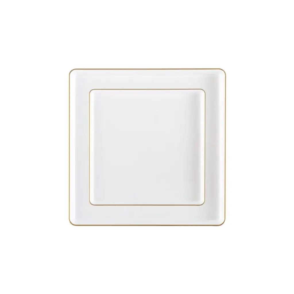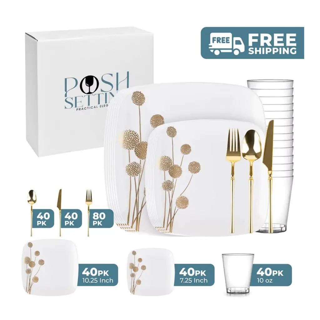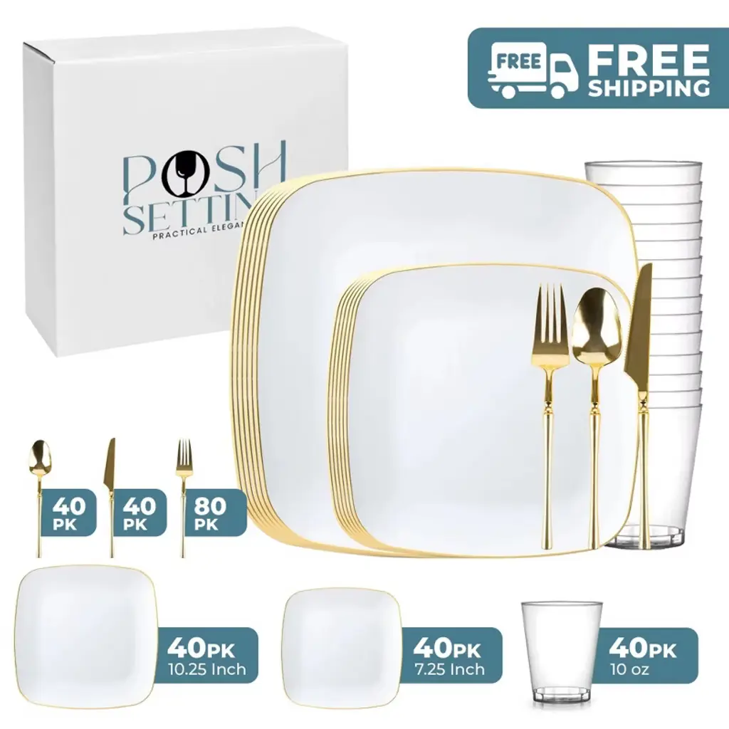Posh Setting 280 Piece White And Gold Plastic Party Bundle - Square Edge (40 Settings)