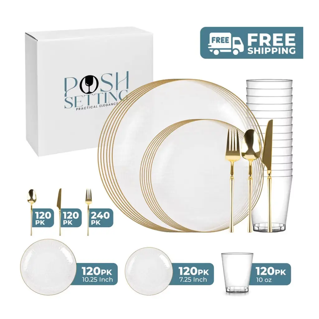 Posh Setting Elegant White and Gold Disposable Dinnerware Bundle offers the ultimate convenience for hosting upscale events. This all-inclusive set features dinner plates, salad/appetizer plates, 10oz clear hard plastic cups, spoons, knives, and double forks per setting, all in a refined White and Gold design. Ideal for weddings, parties, and upscale gatherings, ensuring easy cleanup.